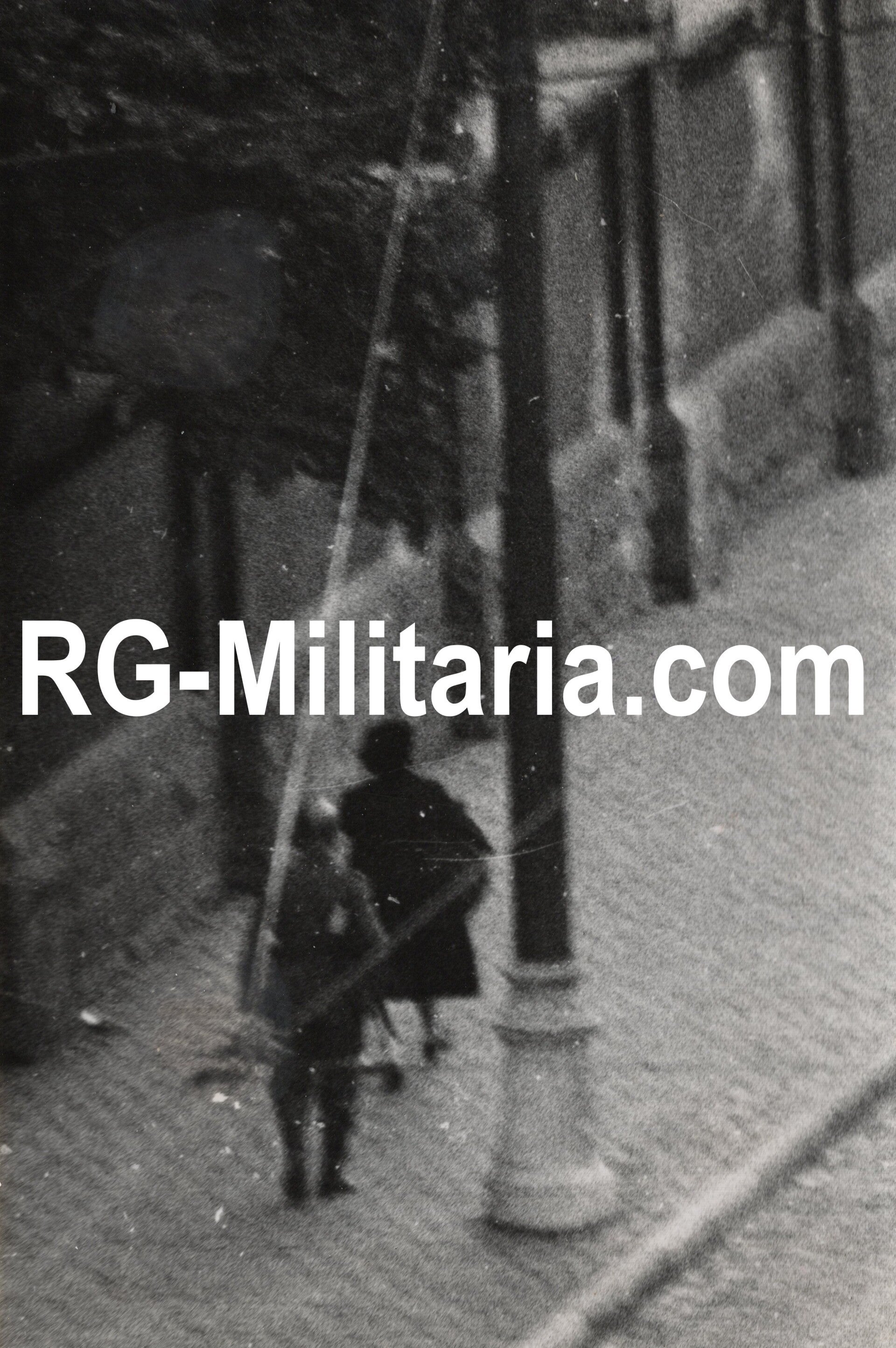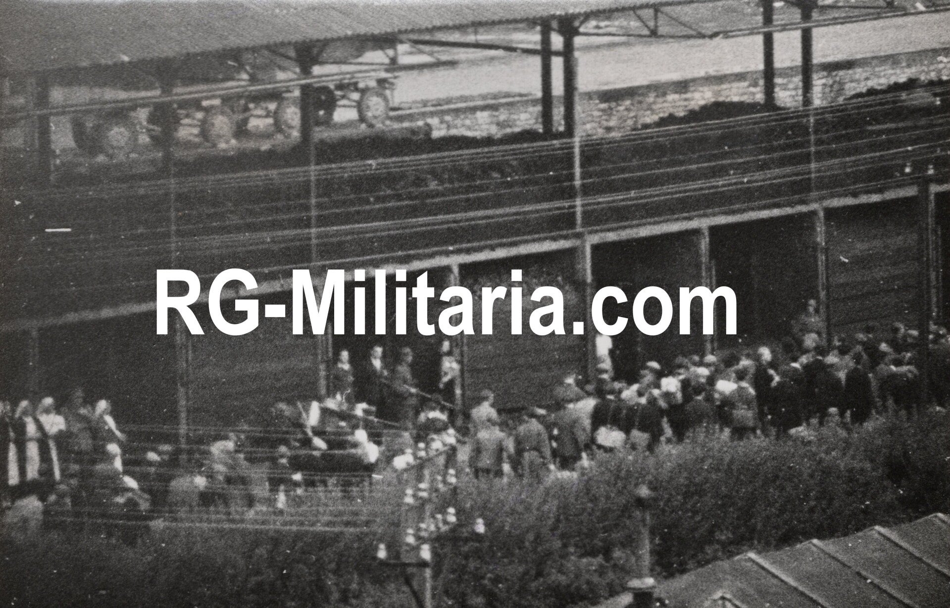 ''This report was carried out under special conditions during the occupation. The departure of the draft dodgers and the flight of the people of the new order, a few days before the liberation, generally took place from Etterbeek station. The security services and surveillance exercised by the Germans around the station were particularly severe. Our agency, having secured the assistance of one of the Red Cross nurses who was on duty at Etterbeek station, managed to produce various reports despite the German surveillance. The two photographers, with the help of this nurse, were hidden above the "Au Phare" café located next to the station and, with a telephoto lens that extended from the embrasure of this turret overlooking the tracks and platforms, were able to take these shots. Given the danger, their courage, and the conditions in which this work was carried out give these reports have a special meaning and value today. N.PM. 35/ Shortly before departure (to Germany), the refractory people are taken under guard to Etterbeek station.''