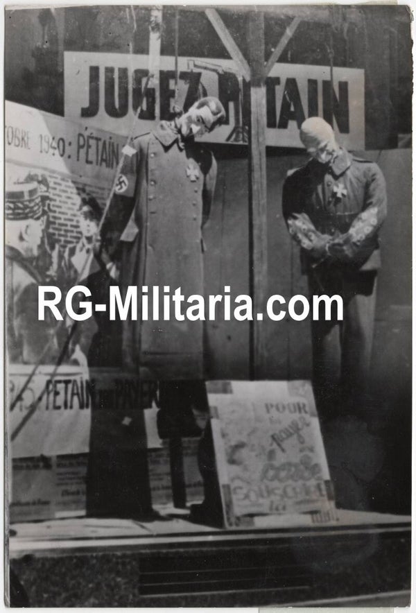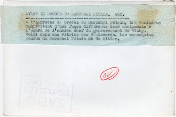 BEFORE THE TRIAL OF MARSHAL Pétain. 680. As the trial of Marshal Pétain approaches, Parisians express their feelings toward the former head of the Vichy government in different ways. Here in a shop window on the Boulevards are the hanging mannequins of Marshal Pétain and Hitler.