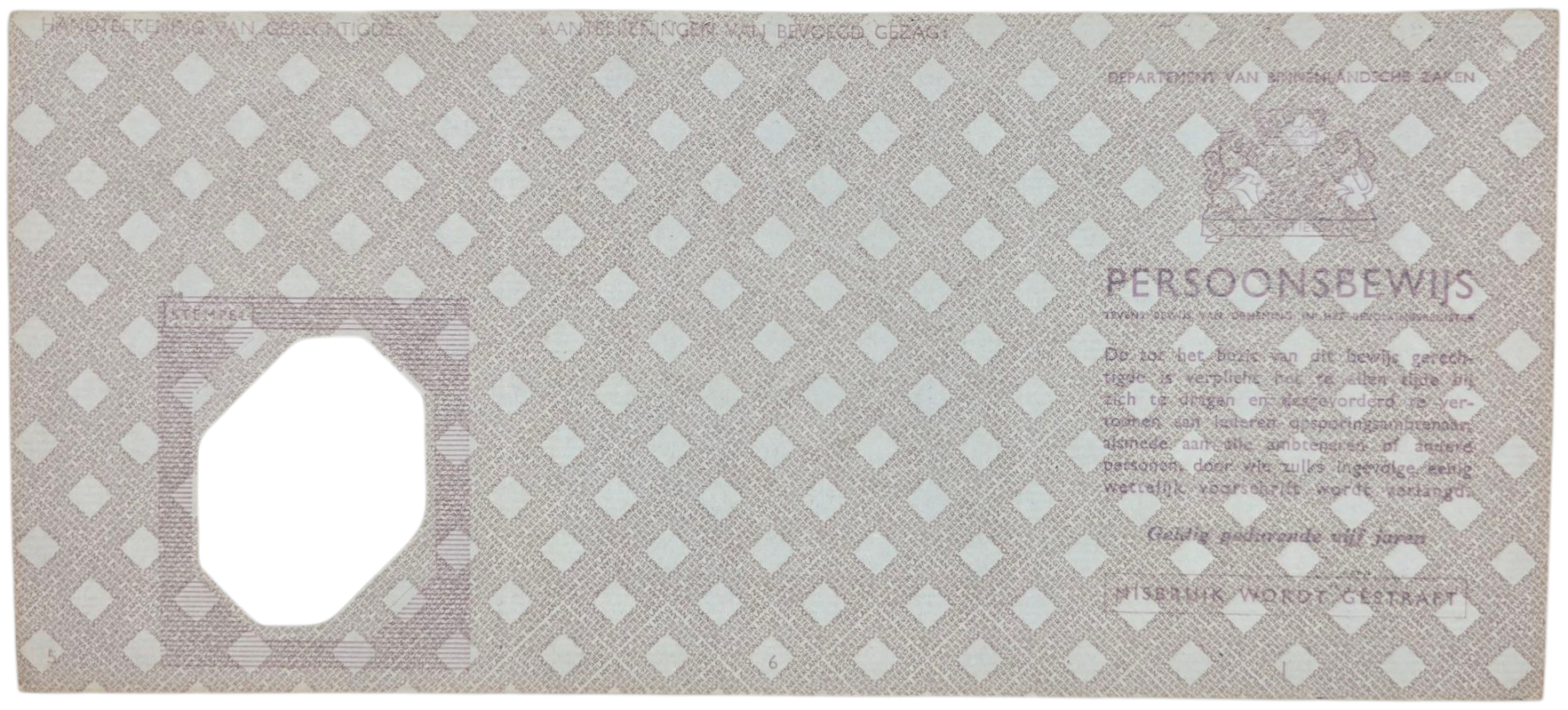 Ongebruikte Nederlandse identiteitskaart ''het Persoonsbewijs'' voor Nederlandse burgers. Het verzet gebruikte ongebruikte persoonsbewijzen zoals deze om andere te vervalsen voor mensen die een nieuwe identiteit nodig hadden (verzetsstrijders of Joodse mensen).