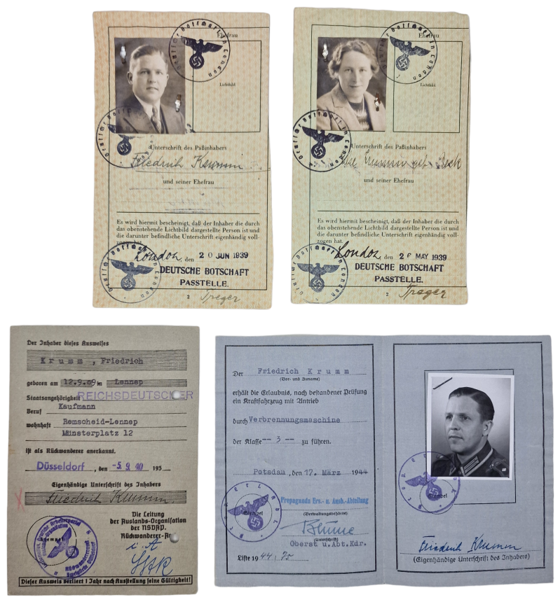 Documentenset van een Duitse burger (Krumm) woonachtig in Londen die bezig was het het terug verhuizen naar Duitsland toen het Verenigd Koninkrijk en Duitsland in staat van oorlog waren. Om deze reden werd Krumm gezien als een ''flüchtlinge'' (vluchteling). Er zitten een aantal brieven bij van het Arbeitsfront maar ook van de Auslands-Organisationen der NSDAP.