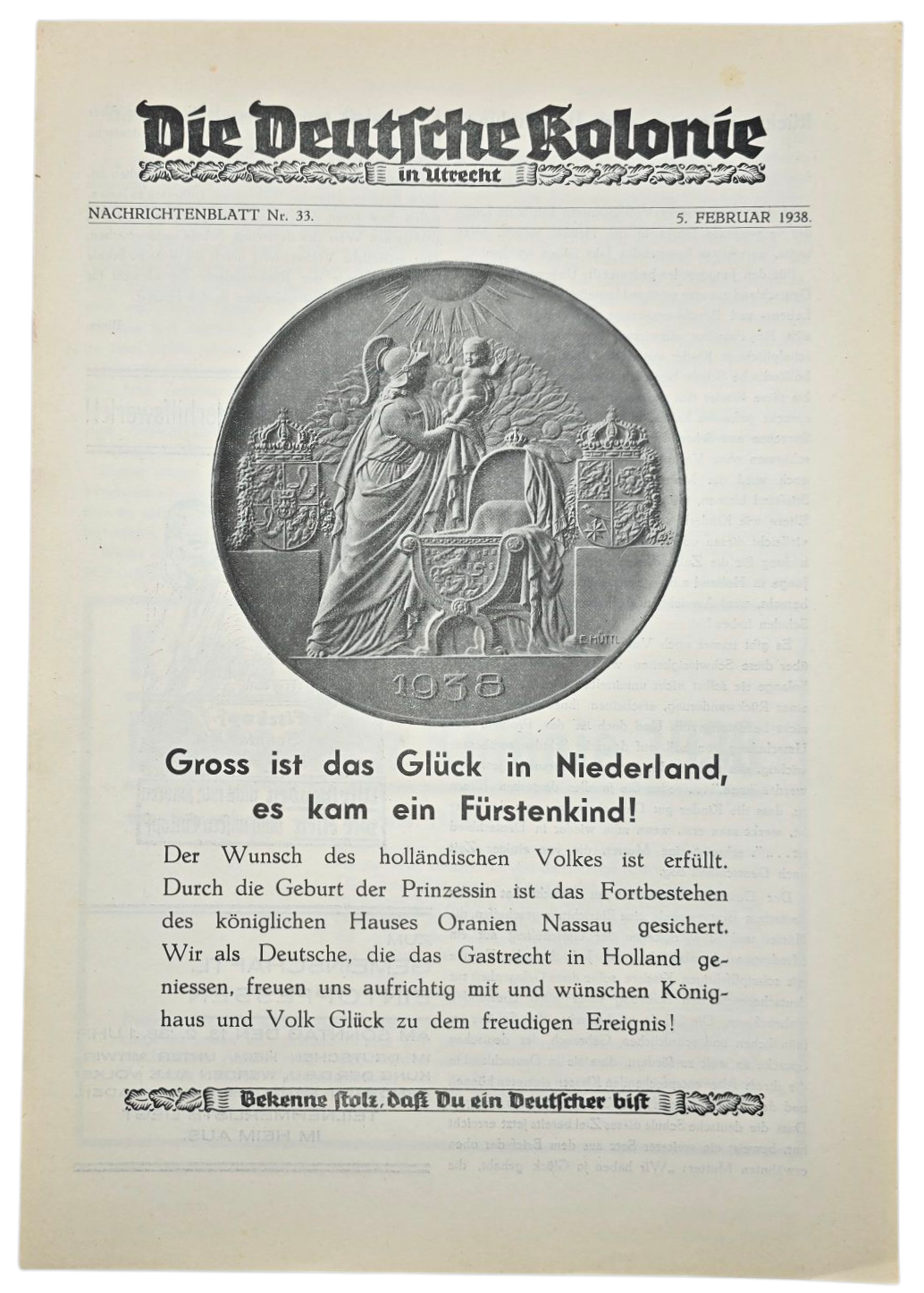 Original WW2 German Dutch Newspaper - Die Deutsche Kolonie in Utrecht No. 33 Birth of Beatrix (1938)