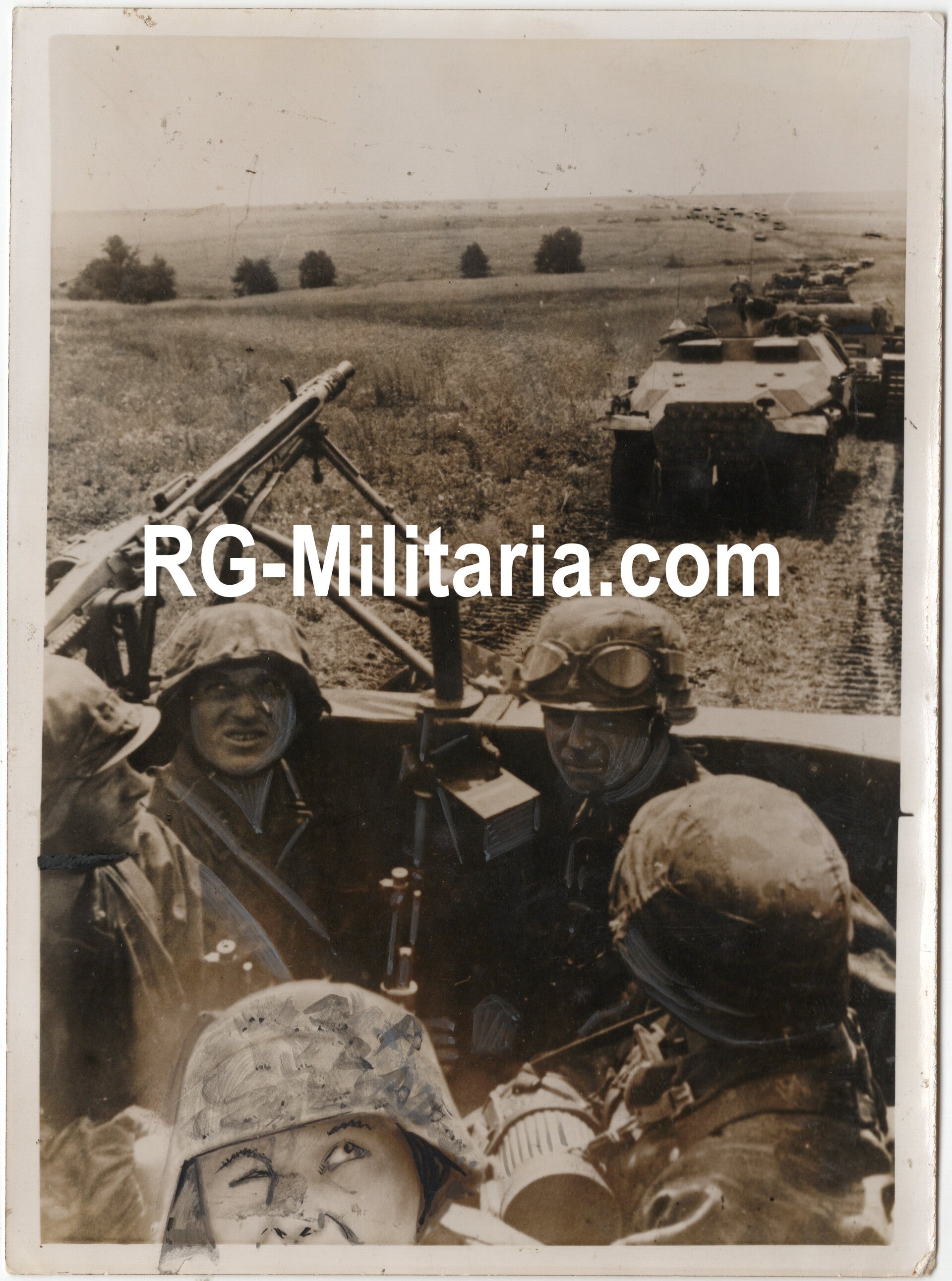 Originele Wo2 Duitse Waffen SS Persfoto - SS militairen in vrachtwagens en tanks vechten tussen Bjelgorod en Orel, Oekraïne (1943)