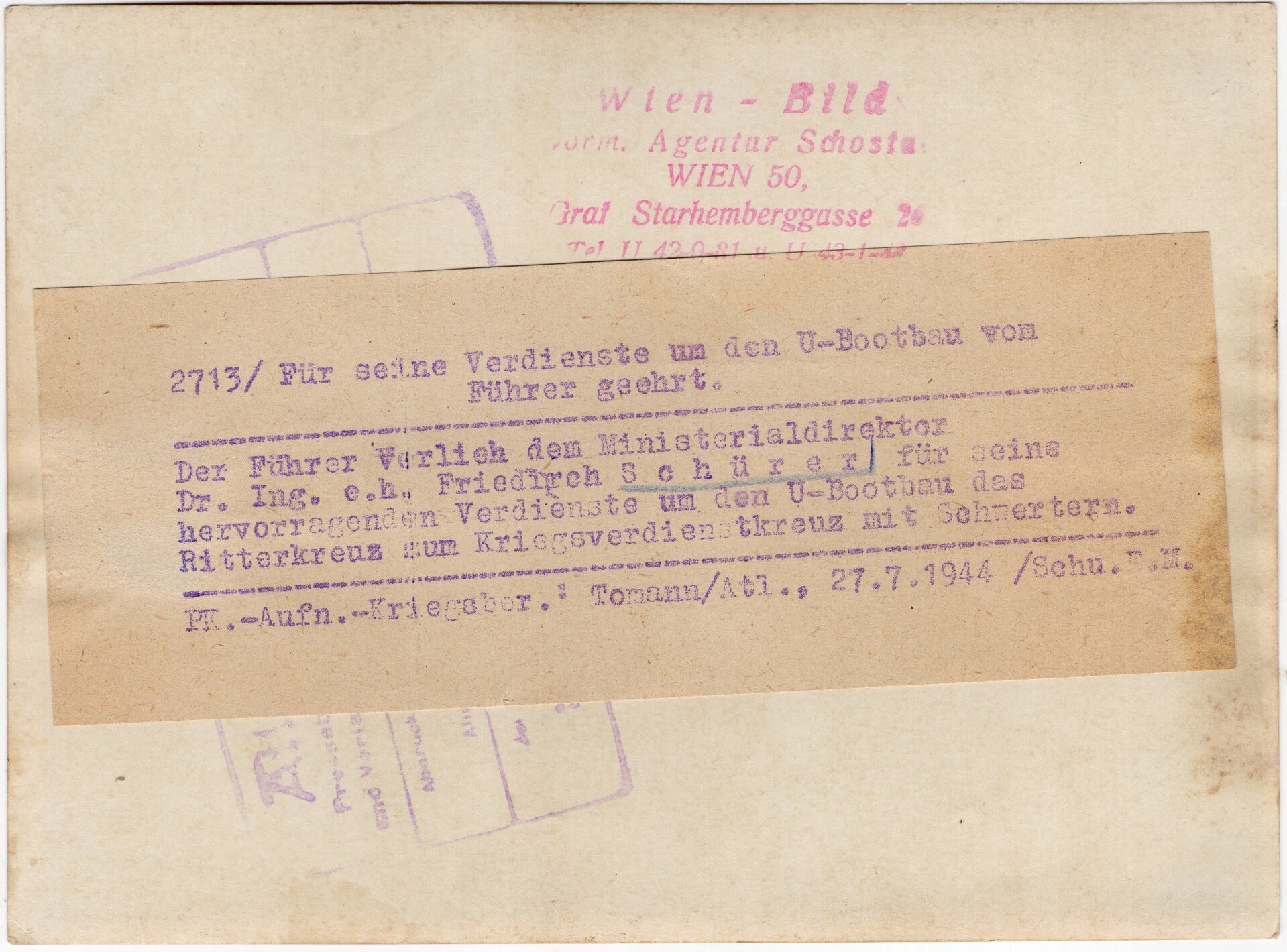 Originele Wo2 Duitse Persfoto - Portret van de Ministermateriaaldirecteur Dr. Ing. Friedrich Schürer, U-Boot-bouwer, Ritterkreuz Kriegsverdienstenkreuz met zwaarden (1944)