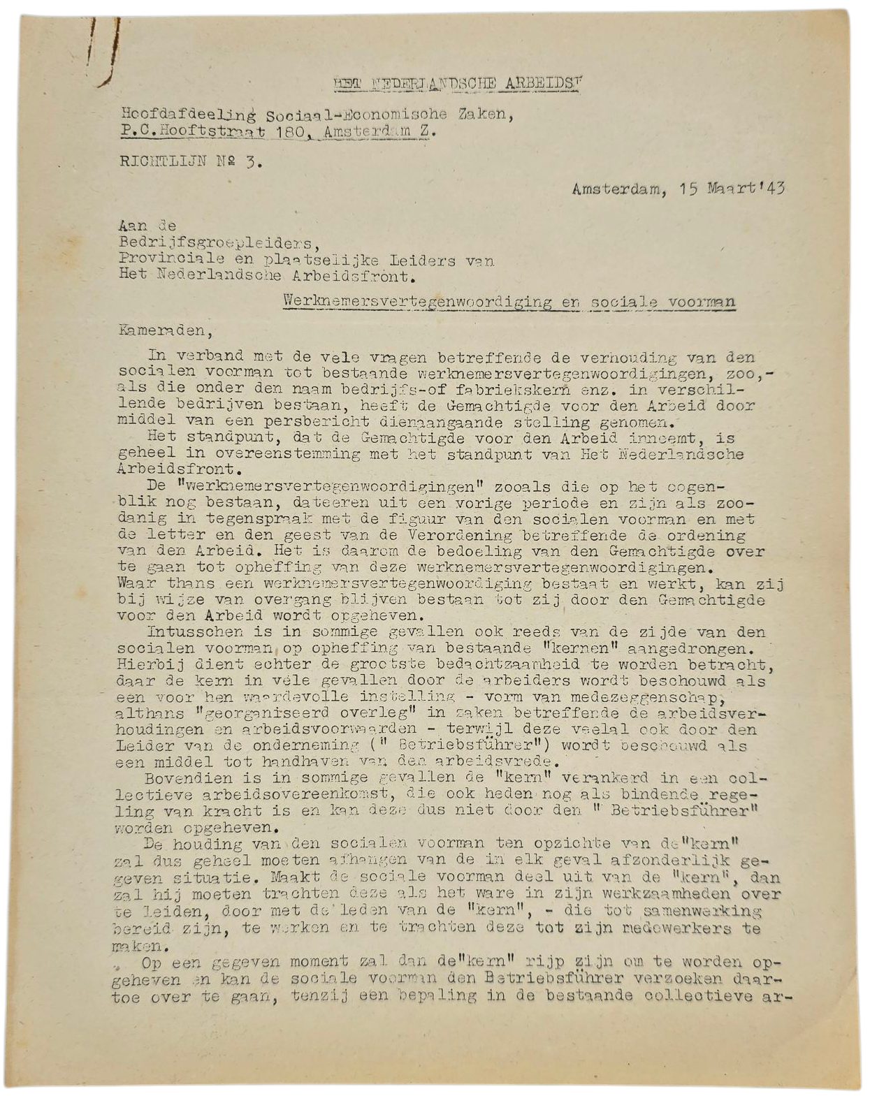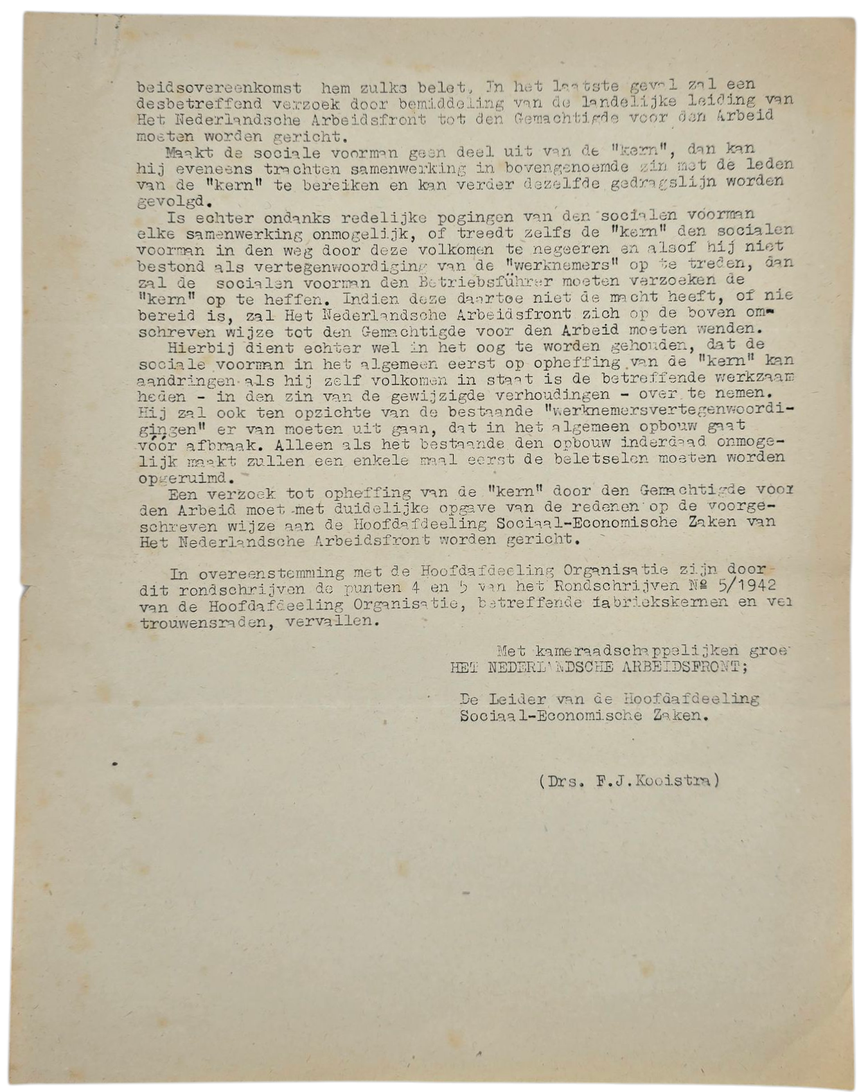 Original WW2 Dutch Collaboration NAF Document - Employee representation and social leader, F. J. Kooistra, Amsterdam (1943)