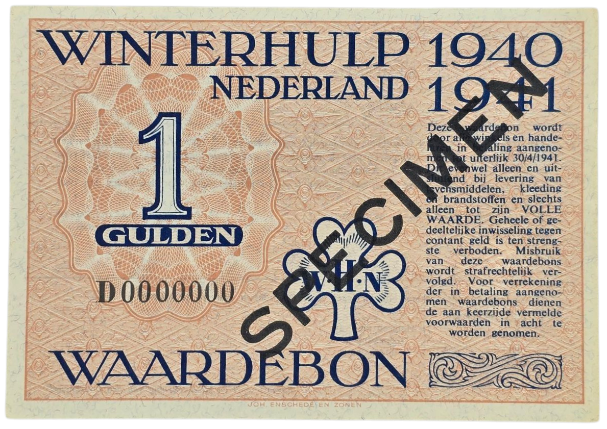 Original WW2 Dutch Collaboration WHN Document - Winterhulp Nederland 1 gulden Waardebon Specimen (1940-1941)