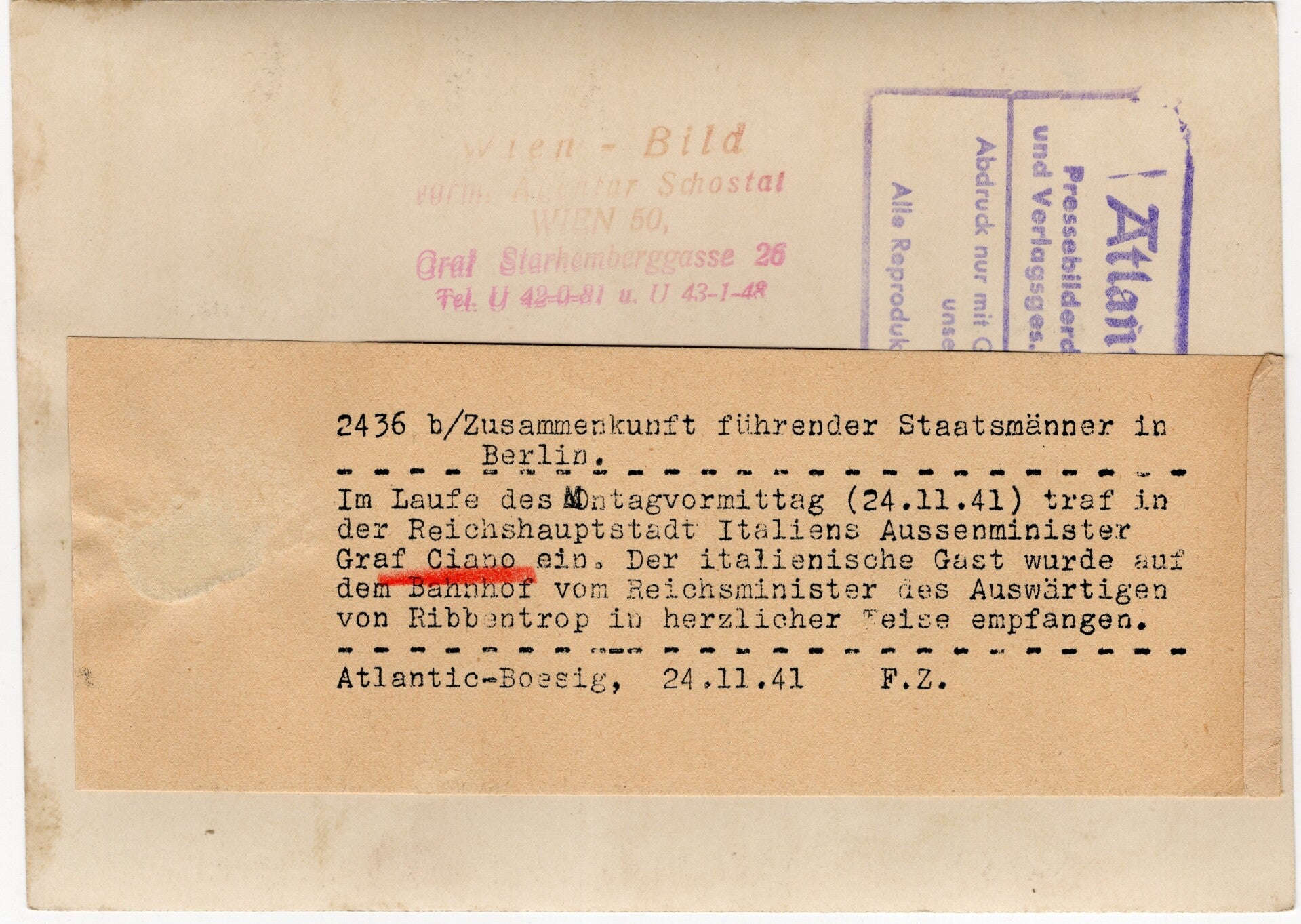 Originele Wo2 Duitse Persfoto - Italiaanse minister Graf Galeazzo Ciano arriveert in Berlijn met Joachim von Ribbentrop (1941)