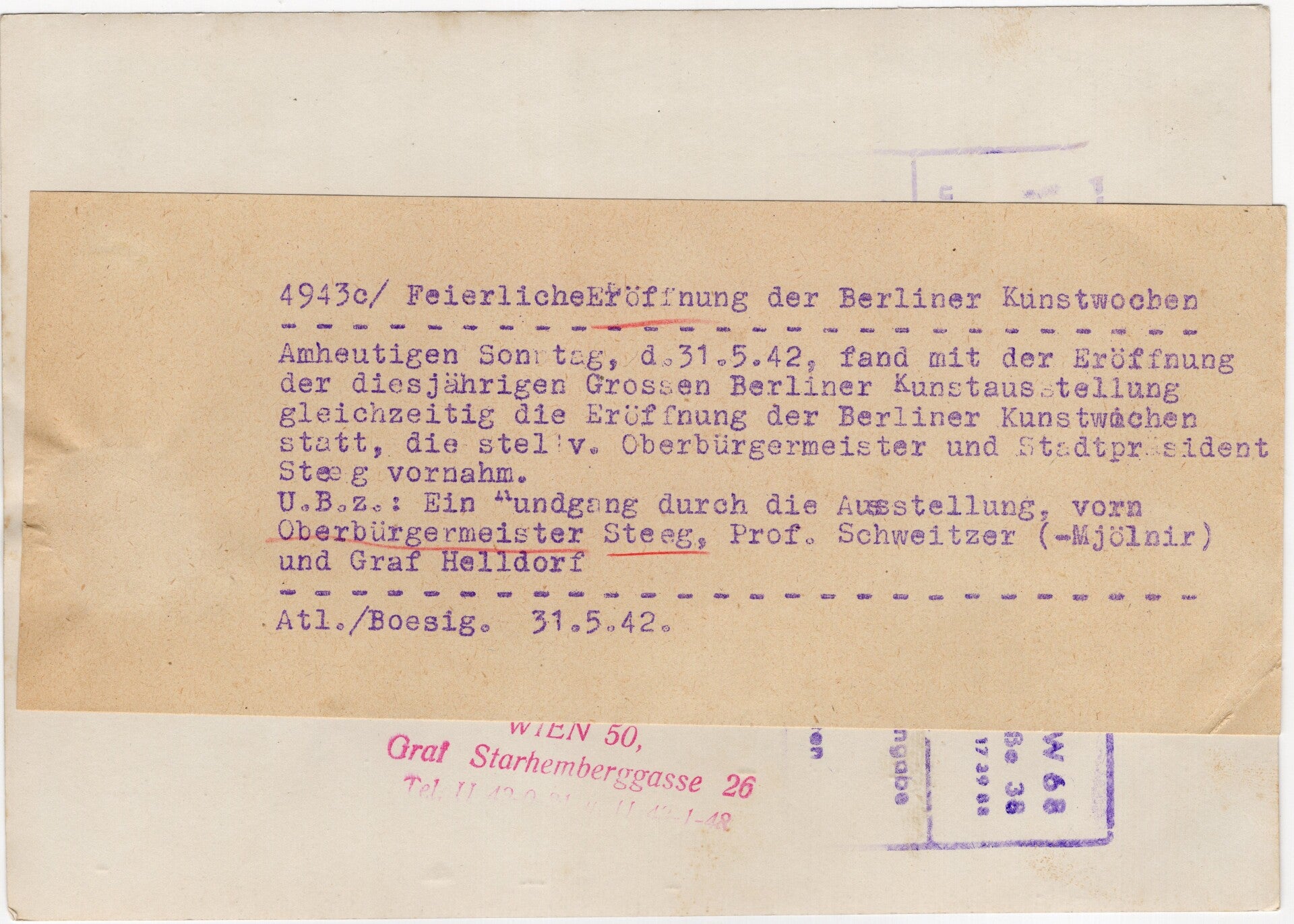 Originele Wo2 Duitse Persfoto - Kunstweek in Berlijn met burgemeester Ludwig Steeg, professor Schweitzer en graaf Helldorf (1942)