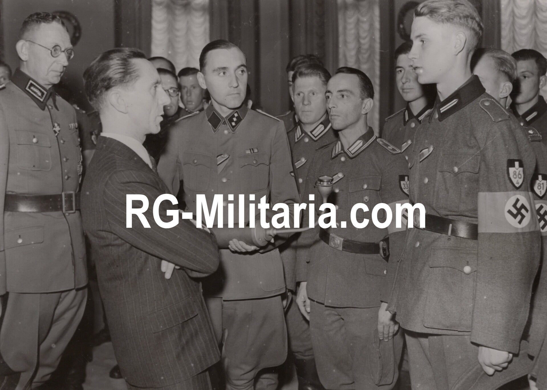 Original WW2 German Press Photo - Dr. Joseph Goebbels talking with RAD soldiers back from the Eastern Front, Berlin (1942)