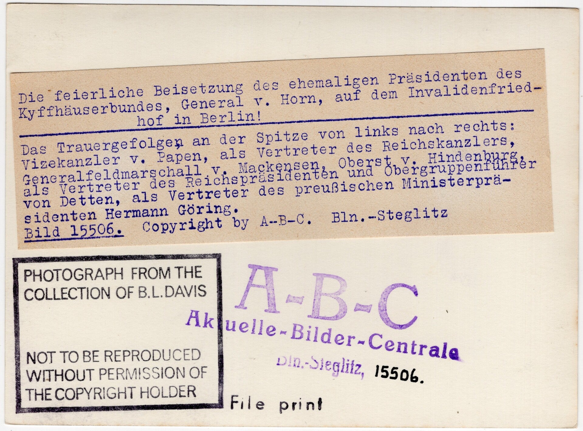 Originele Wo2 Duitse Persfoto - Generalfeldmarschall von Mackensen op de begrafenisstoet van Rudolf von Horn, Berlijn (1934)