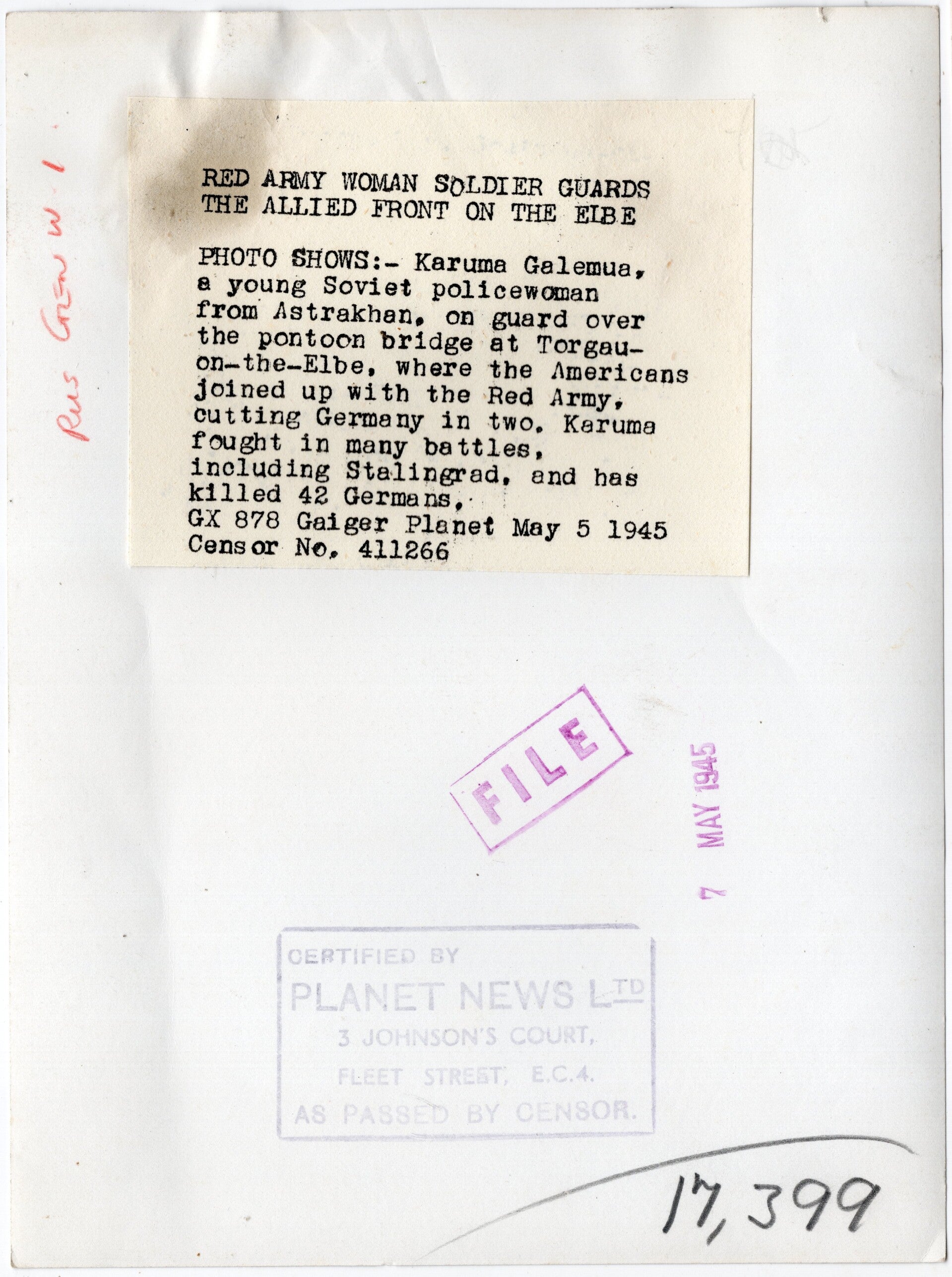 Original WW2 US Press Photo - Russian woman soldier Karuma Galemua guards the Torgau Elbe front (1945)