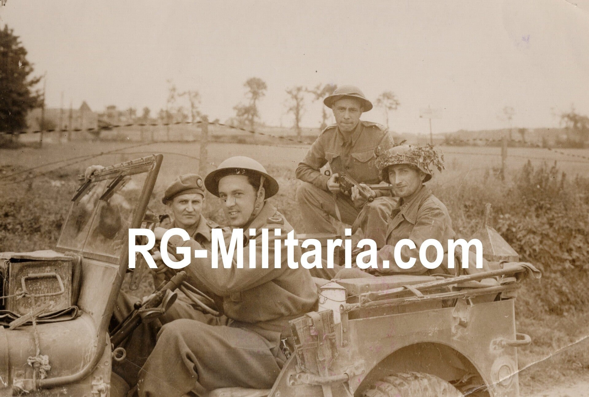 Original WW2 British Press Photo - War Correspondents with a German Fallschirmjager POW soldier in Normandy, Operation Overlord, France (1944)
