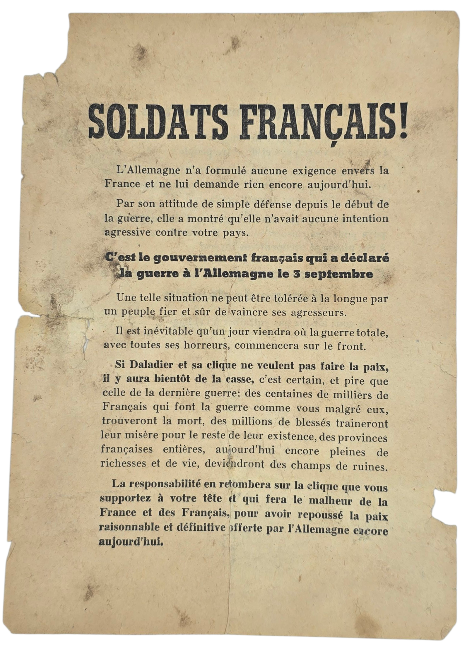 Original WW2 German Leaflet - Phony War, Soldats Francais! L'Allemagne n'a formule? (1940)