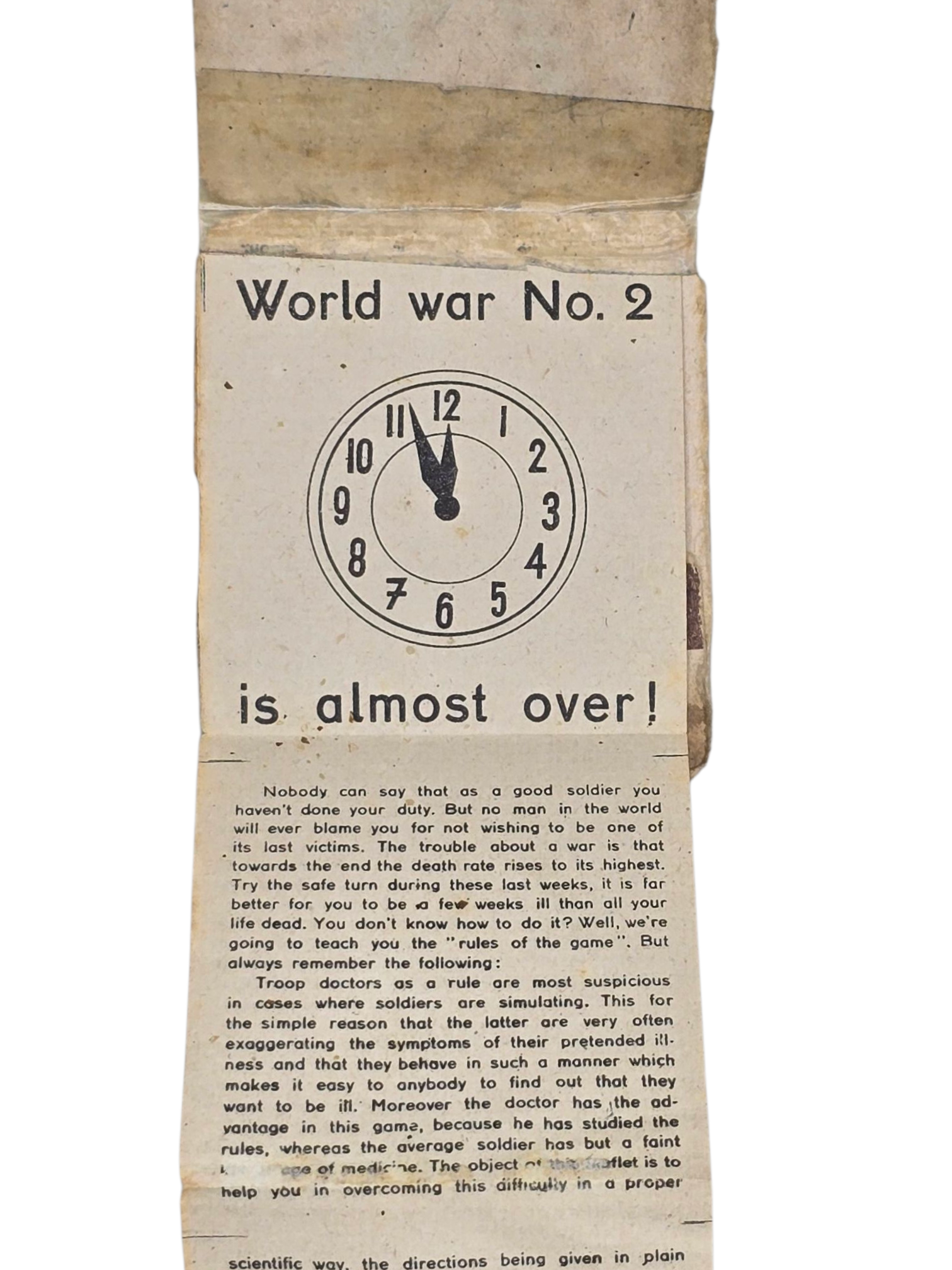 German leaflet for US troops. These look like US matches, but inside there is a long strip of text with information on how to make yourself fake sick, like faking to puke or hurting your arm. With this propaganda, the Germans wanted to make US soldiers leave the front line instead of fighting. Distributed at the Italian front.