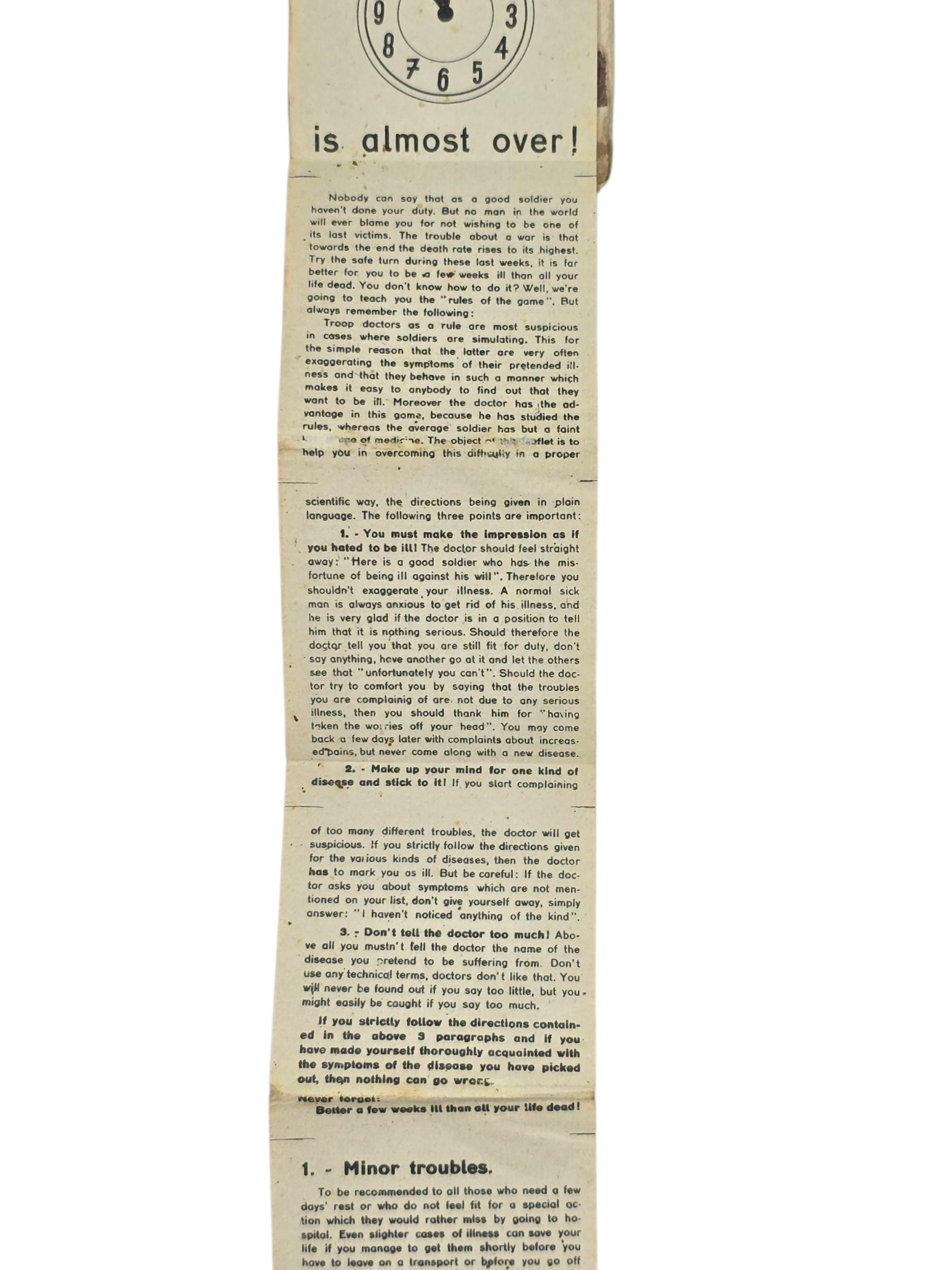 Duits pamflet voor Amerikaanse troepen. Deze lijken op Amerikaanse lucifers, maar er zit een lange tekststrook in met informatie over hoe je jezelf nep-ziek kunt maken, zoals doen alsof je moet overgeven of je arm pijn doen. Met deze propaganda wilden de Duitsers Amerikaanse soldaten ertoe aanzetten de frontlinie te verlaten in plaats van te vechten. In Italië verstrooid.