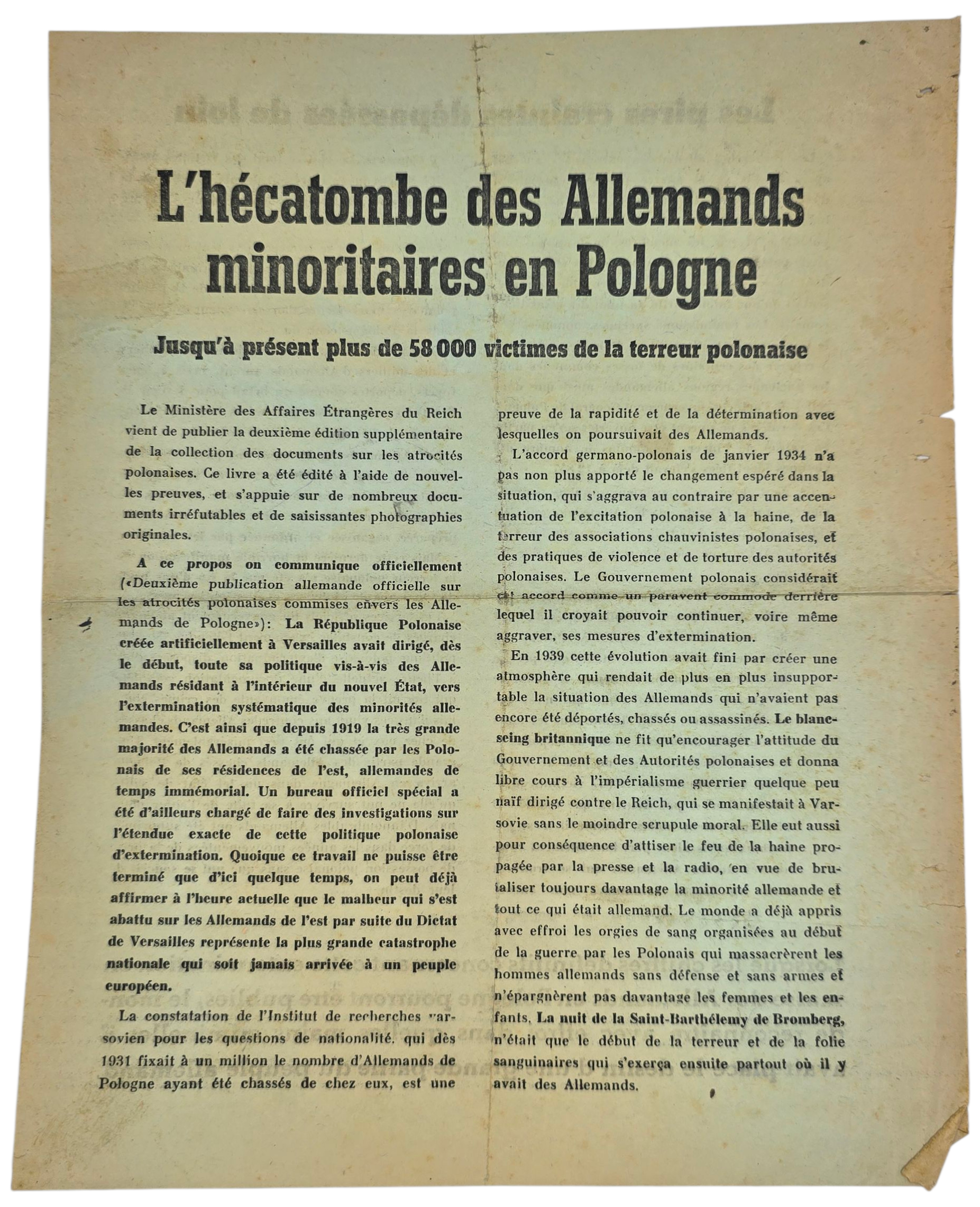 Original WW2 German Leaflet - L'hecatombe des Allemands minoritaires en Pologne, killing of Germans in Poland (1940)
