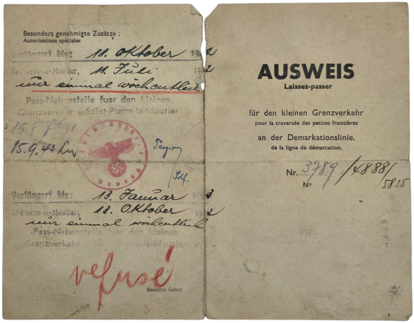 Original WW2 French Document - Ausweis an der Demarkationslinie, St Pierre, France (1942)