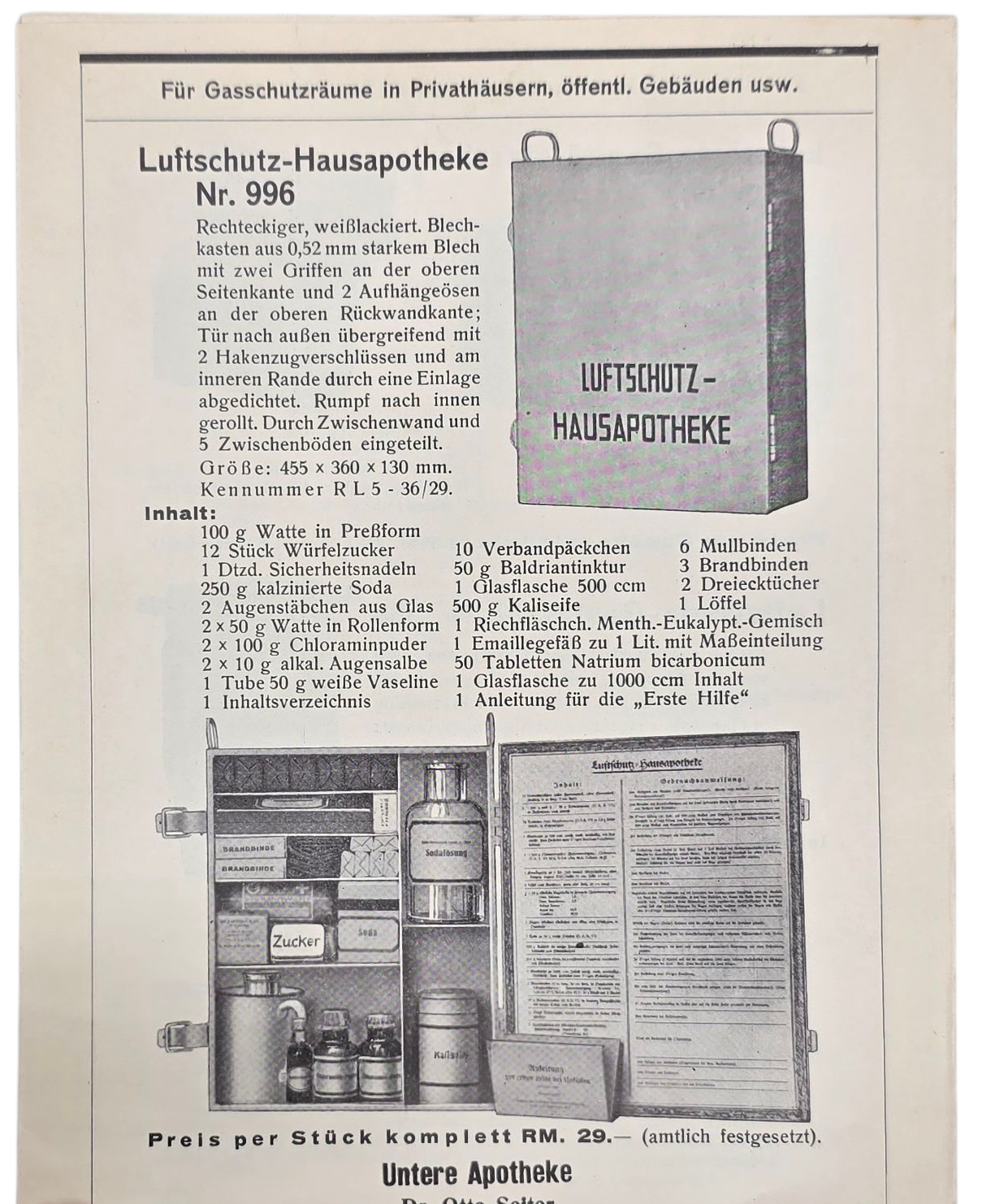 Luftschutz sales flyer with things like the Luftschutz Hausapotheke, Gastasche, Sanitatstasche etc.