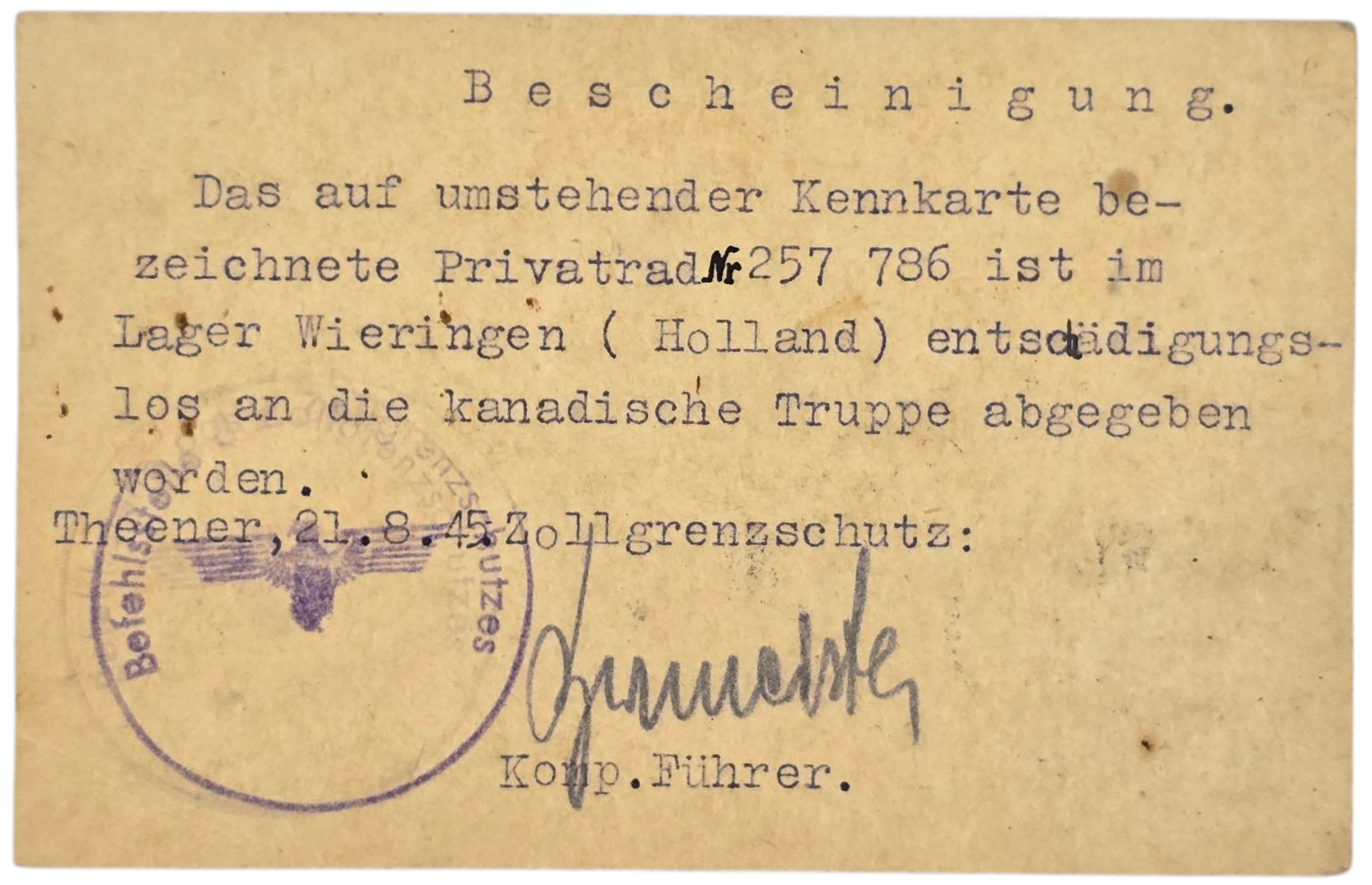 Interesting late war document of a German Zollgrenzschutz soldier who handed in his bike to a Canadian soldier in the camp Wieringen. Written at Theener on the 21th of August 1945. The fieldpost number 33219 states the following: