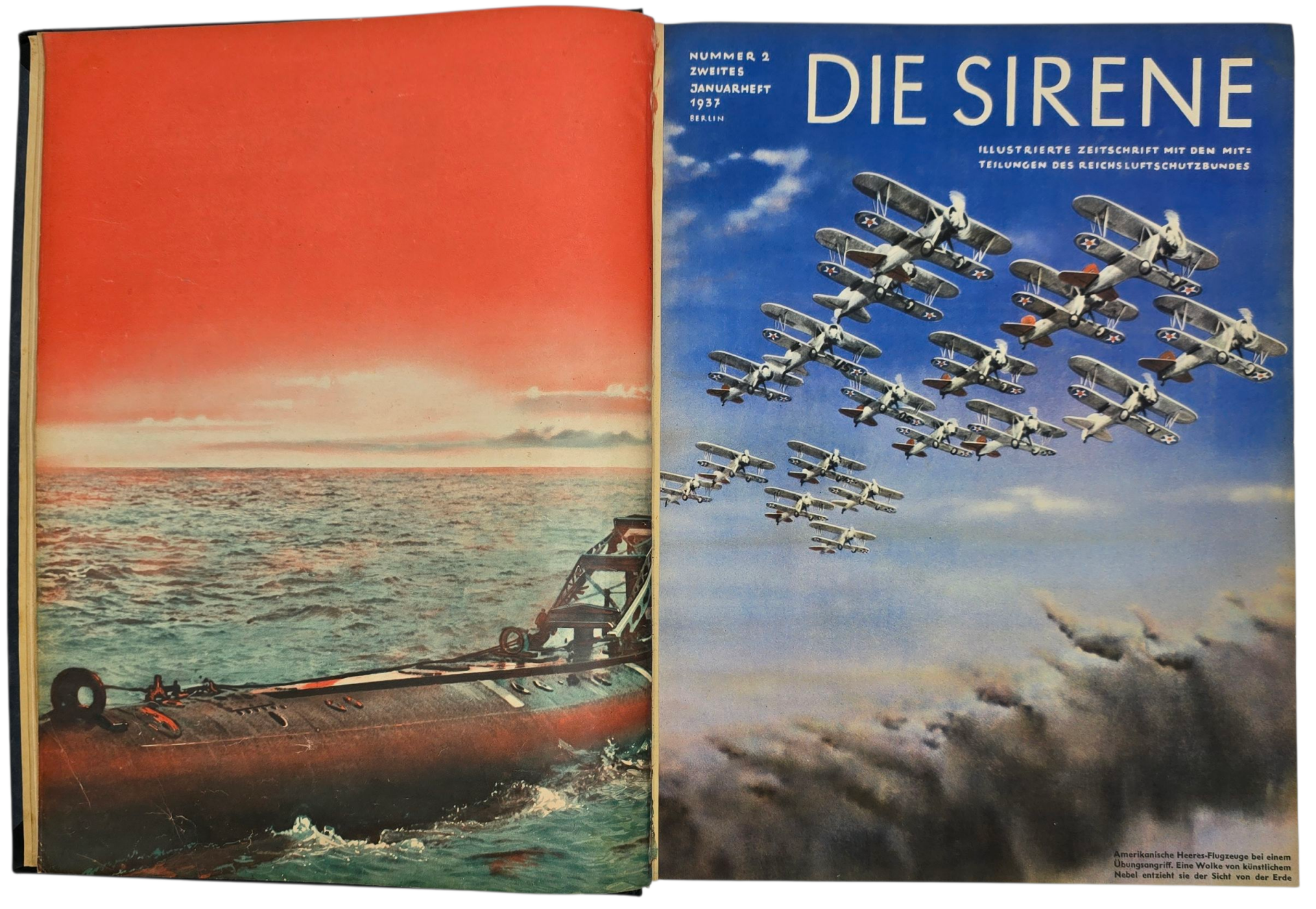 This is a Period-bound Reichsluftschutz magazine, Die Sirene, from 1937. It has 26 numbers in total. The book appears to be in good condition. This magazine has many interesting advertisements and articles about the German Luftschutz. From the 10th number, the magazines have been ''chopped'' a little bit during the binding process.