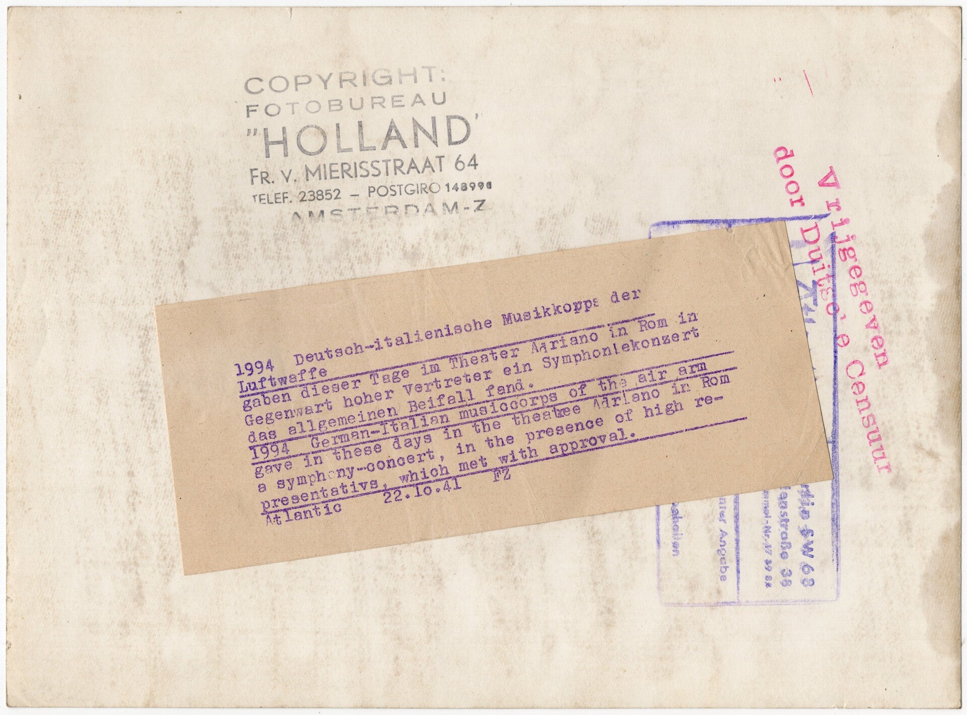 Originele Wo2 Duitse Persfoto - Duits-Italiaans muziekkorps van de Luftwaffe in Theater Adriano, Rome (1941)