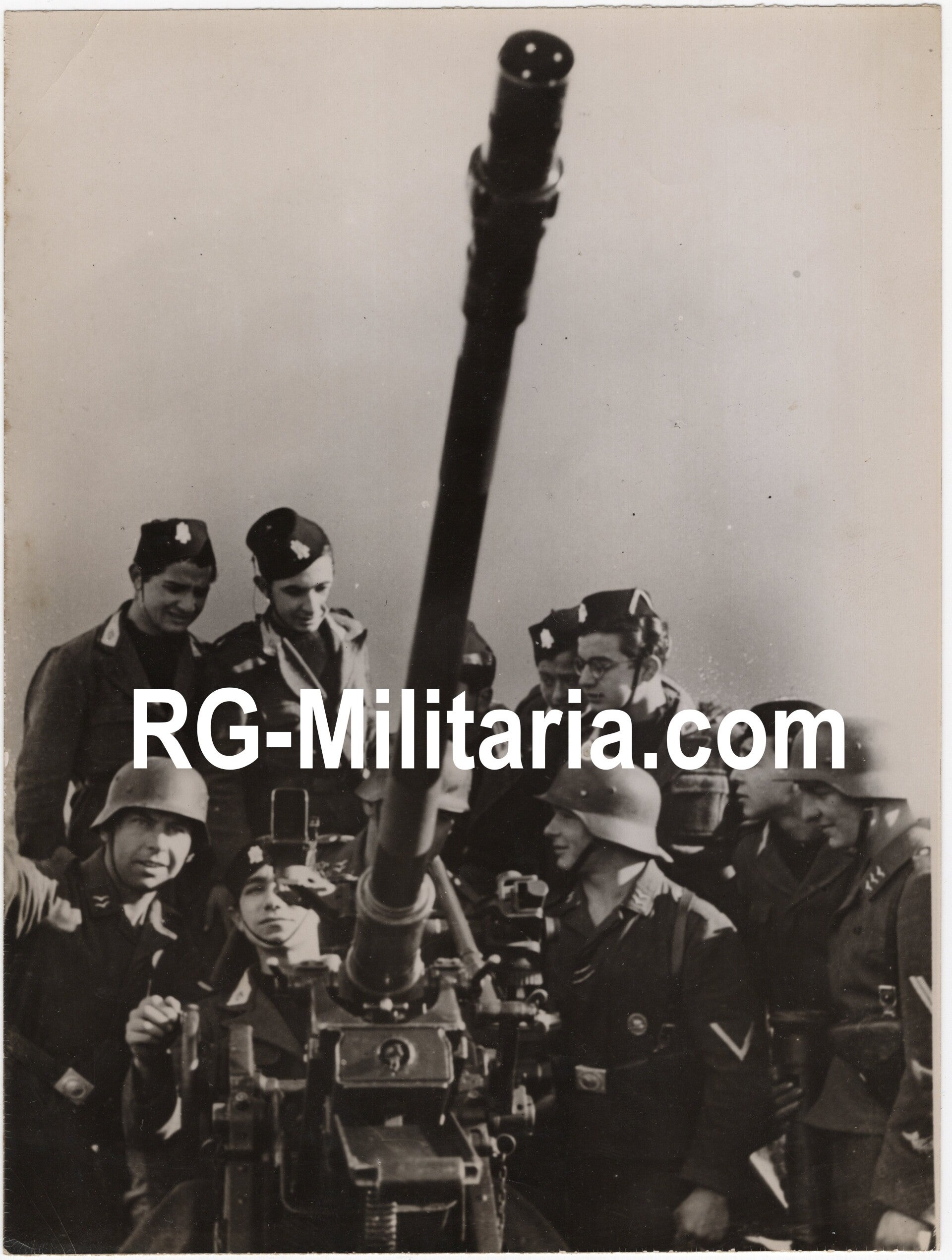 Original WW2 German Press Photo - Italian fascist youth ''Avanguardisti'' behind a Luftwaffe flak canon (1941)