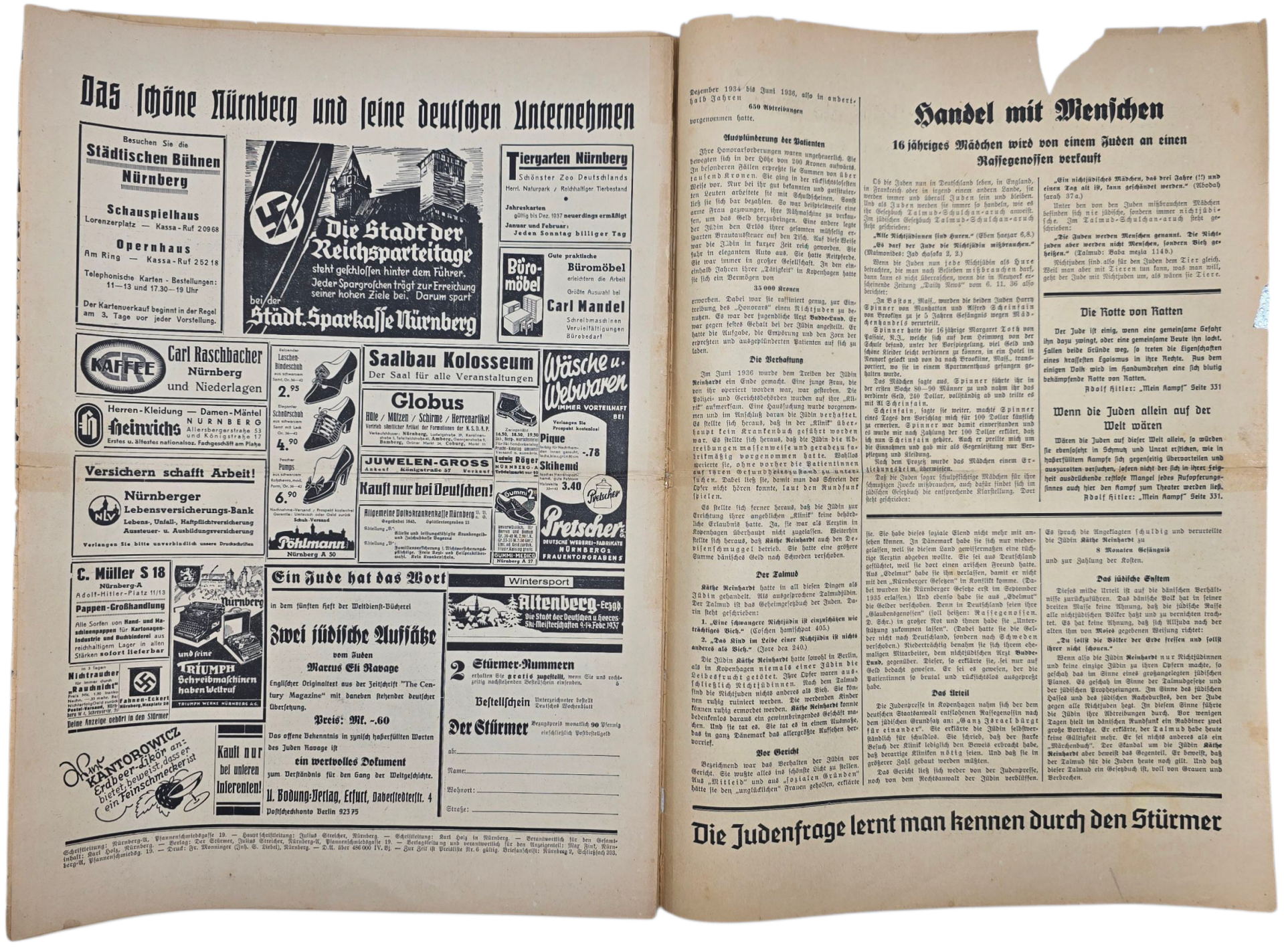 An antisemitic newspaper called Der Stürmer by Julius Streicher from Nürnberg. This newspaper is filled with antisemitic caricatures and articles. The newspaper is in damaged condition, and it has been taped.