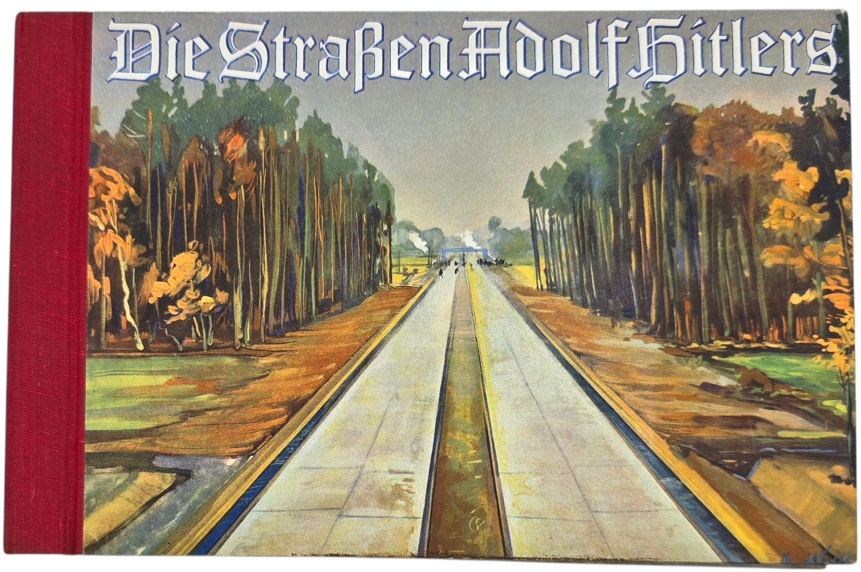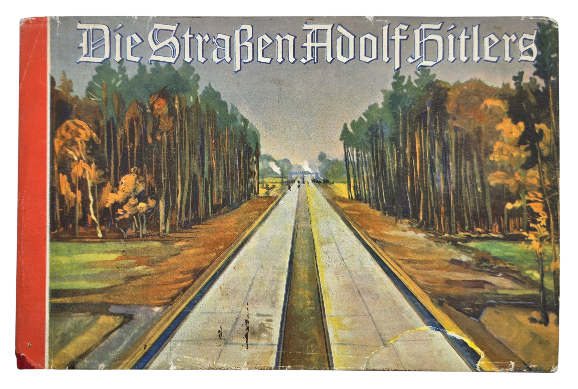 Interesting book about the highways ''made possible'' by Adolf Hitler. The book was written by Ernst Vollbehr. The book is filled with 60 color drawings about the building progress. The dustcover has been repaired with acid-free tape. At the end of the book, a binding reinforcement appears to be stuck on the page; this appears to be a mistake from the binding of the book in 1935.