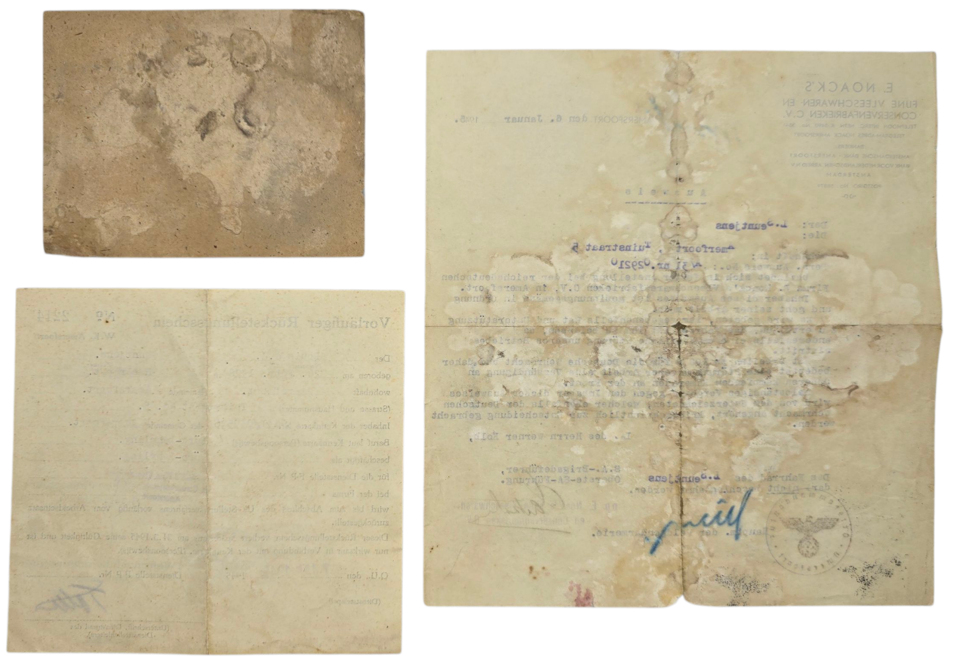 Interesting set of three ausweisen from a civilian in Amersfoort (born in Herpt). One Freistellungs Bescheinigung for the Schanzarbeiten (Forced labour) by the NSDAP. One Vorläufiger Rückstellungsschein and a ausweis from the company where Seuntjes worked, the E. Noack's Fijne Vleeschwaren- en conservenfabriek. The last document is very fragile.