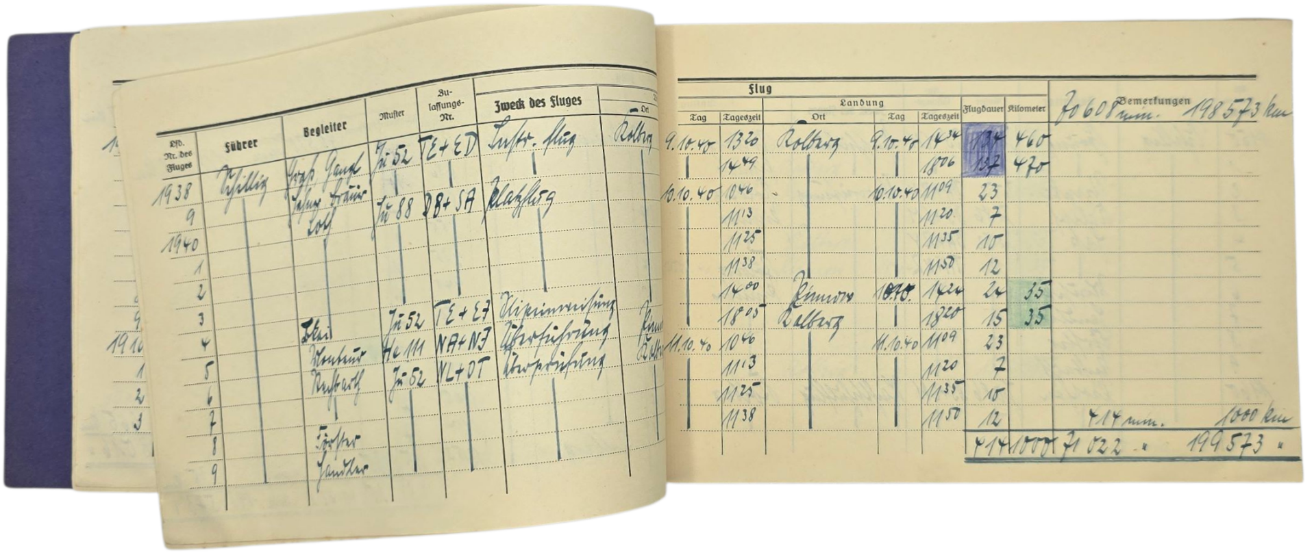 The first Luftwaffe Flugbuch registration starts on the 13th of July 1937 with a log of the Junkers W34D, flight number 292. He learned to fly at the Kampffliegerlehrgang Oldenburg. He flew his first Junkers JU 52 in October 1938. Airfields he was frequently at were Oldenburg, Kolberg, Parchim, Gardelegen, and Märkisch-Friedland. The set consists of 4 Flugbücher. His flight logs 292 to 2961 were registered. The last entry (2961) in the Flugbuch was made on the 13th of October 1941. On the 1st of April 1943, he got promoted to Hauptmann.