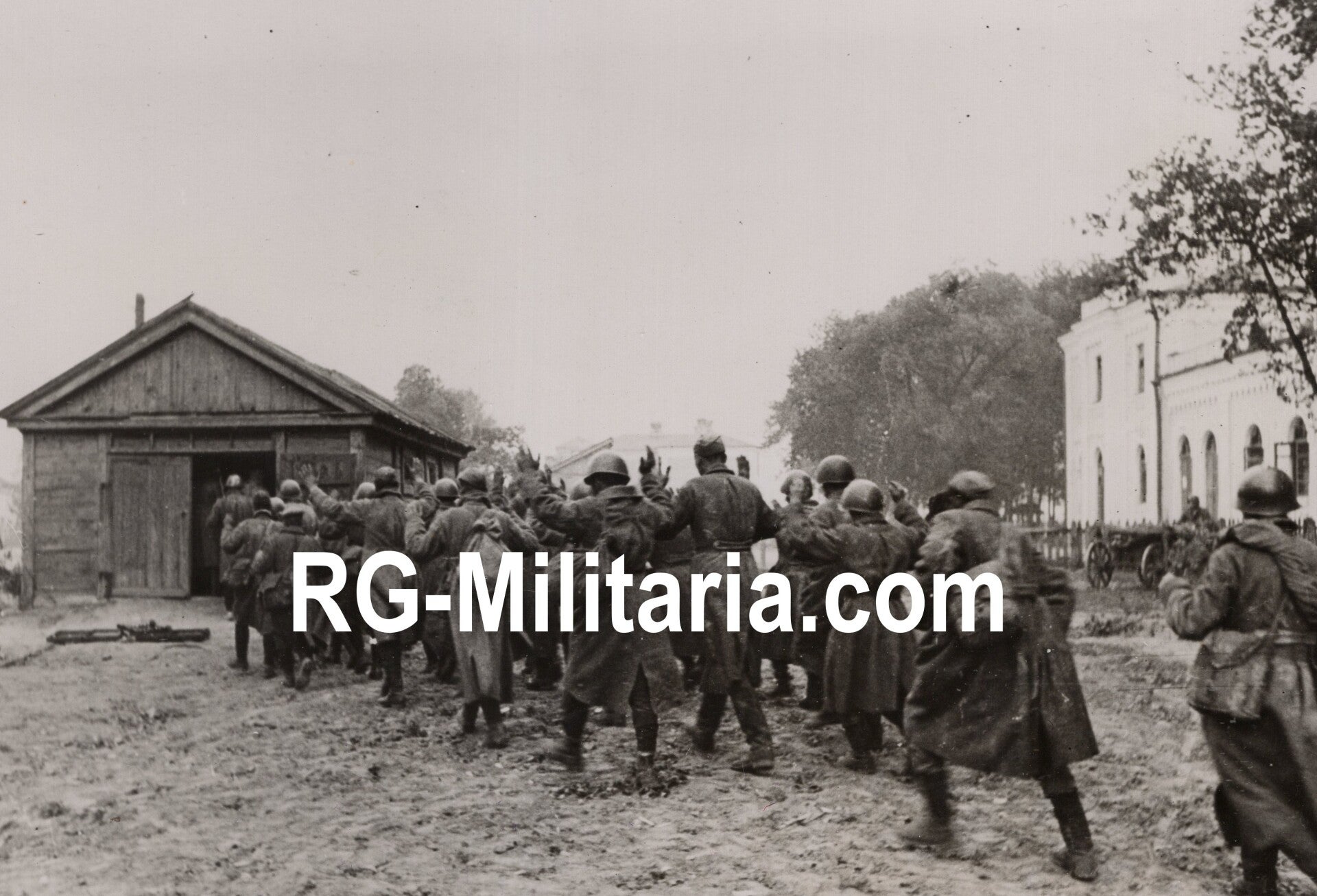 Original WW2 German Press Photo - Soviet POW prisoners walking into a building, Eastern Front (1941)