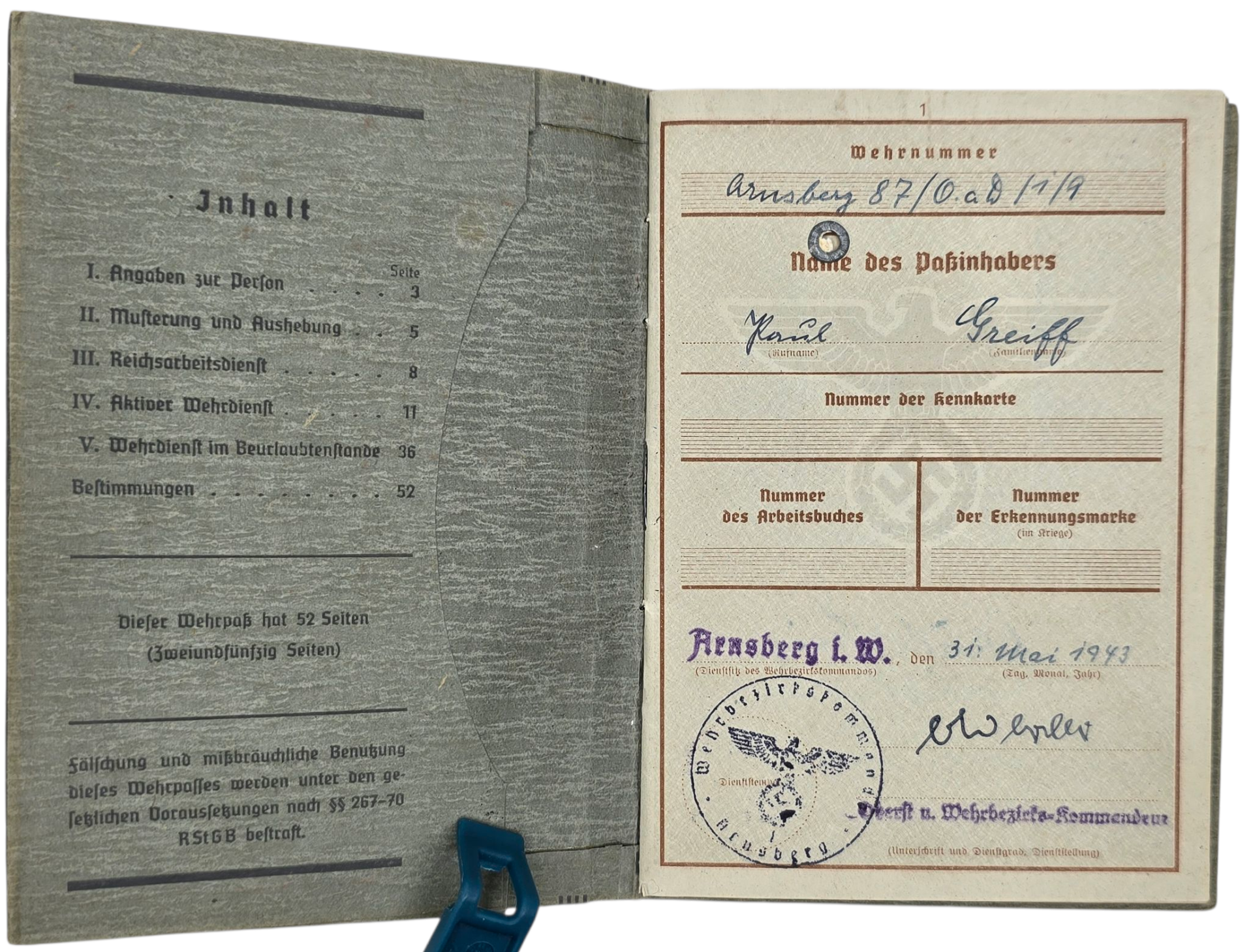 Wehrpass of a German soldier of the Bau Bataillon 80 and later the Bau Bataillon 6 ''Arnsberg''. In 1940 he worked in France and later he was transferred to the Eastern Front, mainly in Minsk and Wilna. On the cover, an allied document was glued to it.