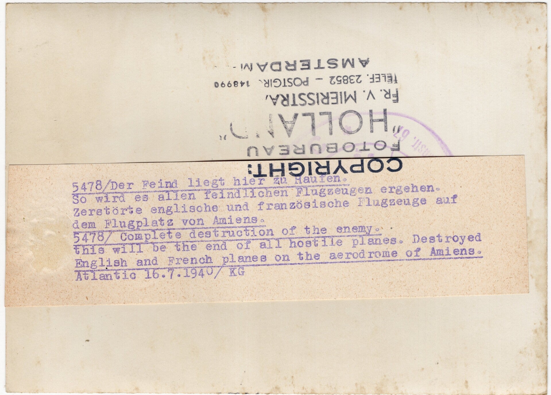 Originele Wo2 Duitse Persfoto - Vernietigde Franse en Britse vliegtuigen op vliegveld Amiens, Frankrijk (1940)