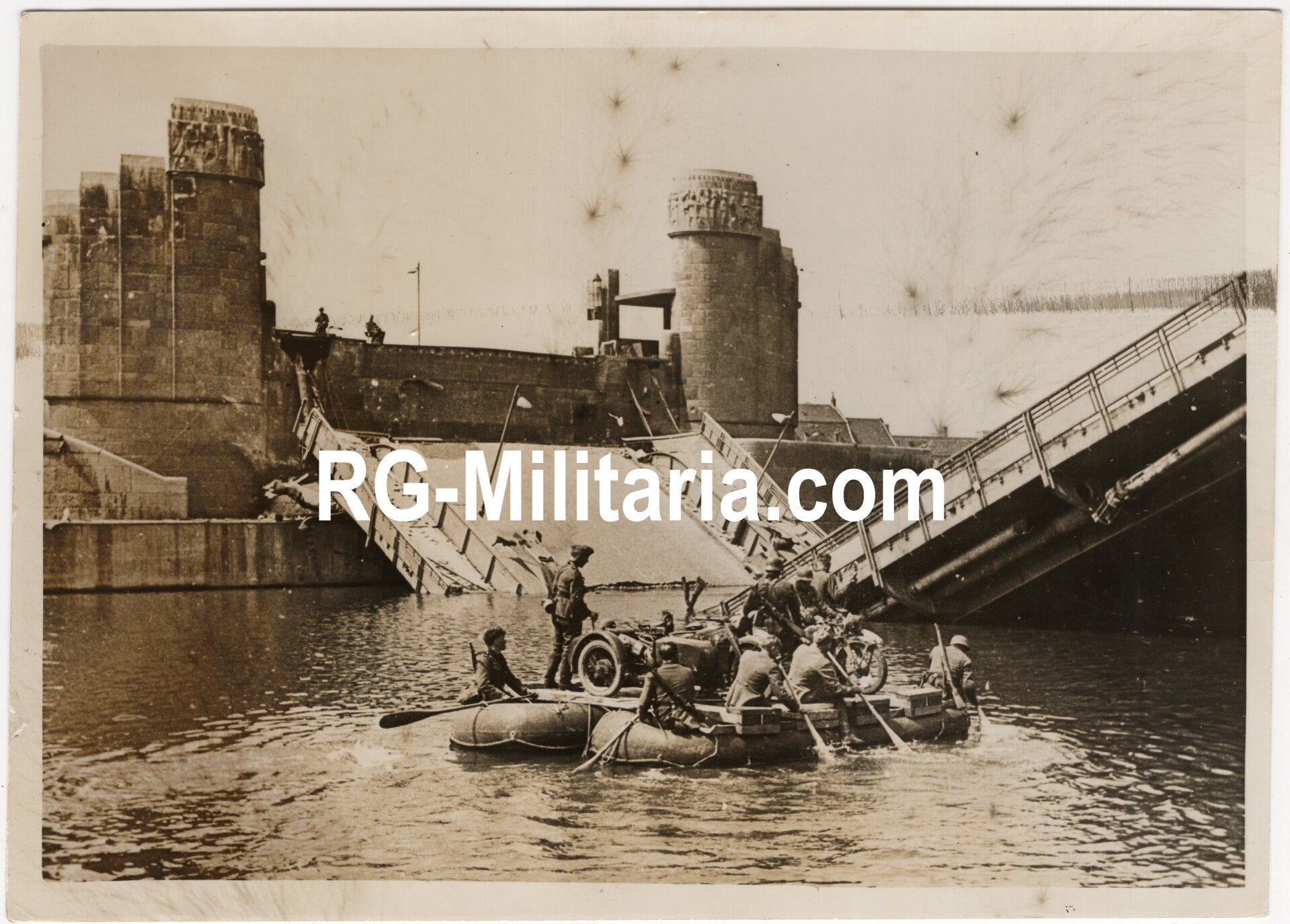 Original WW2 German Press Photo - German boat crossing the blown-up Wilhelminabrug in Maastricht, Holland, May (1940)