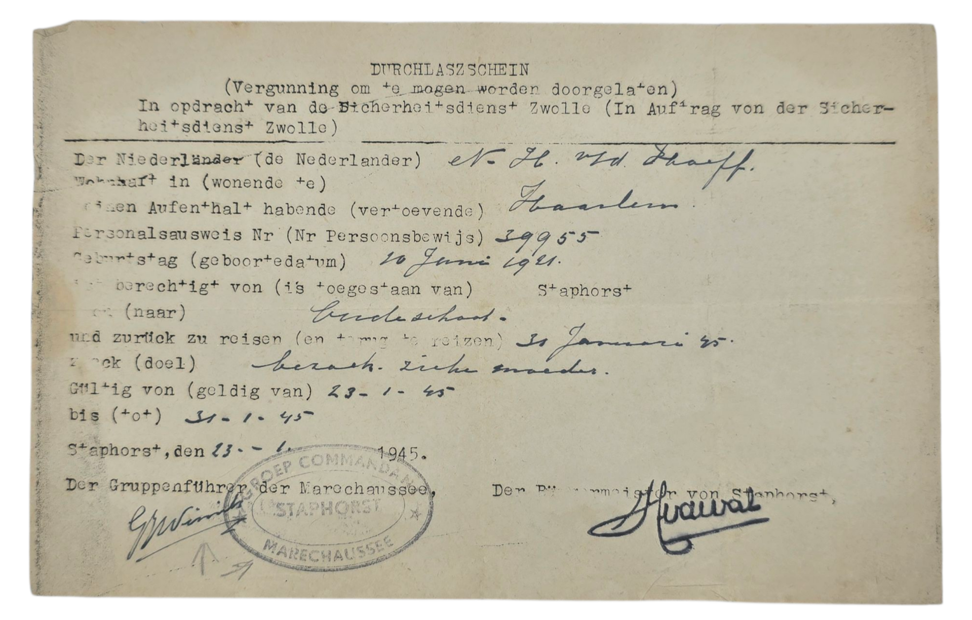 Original WW2 Dutch Document - Durchlaszschein SD Zwolle, Haarlem, Staphorst, Bunschoten (1945)