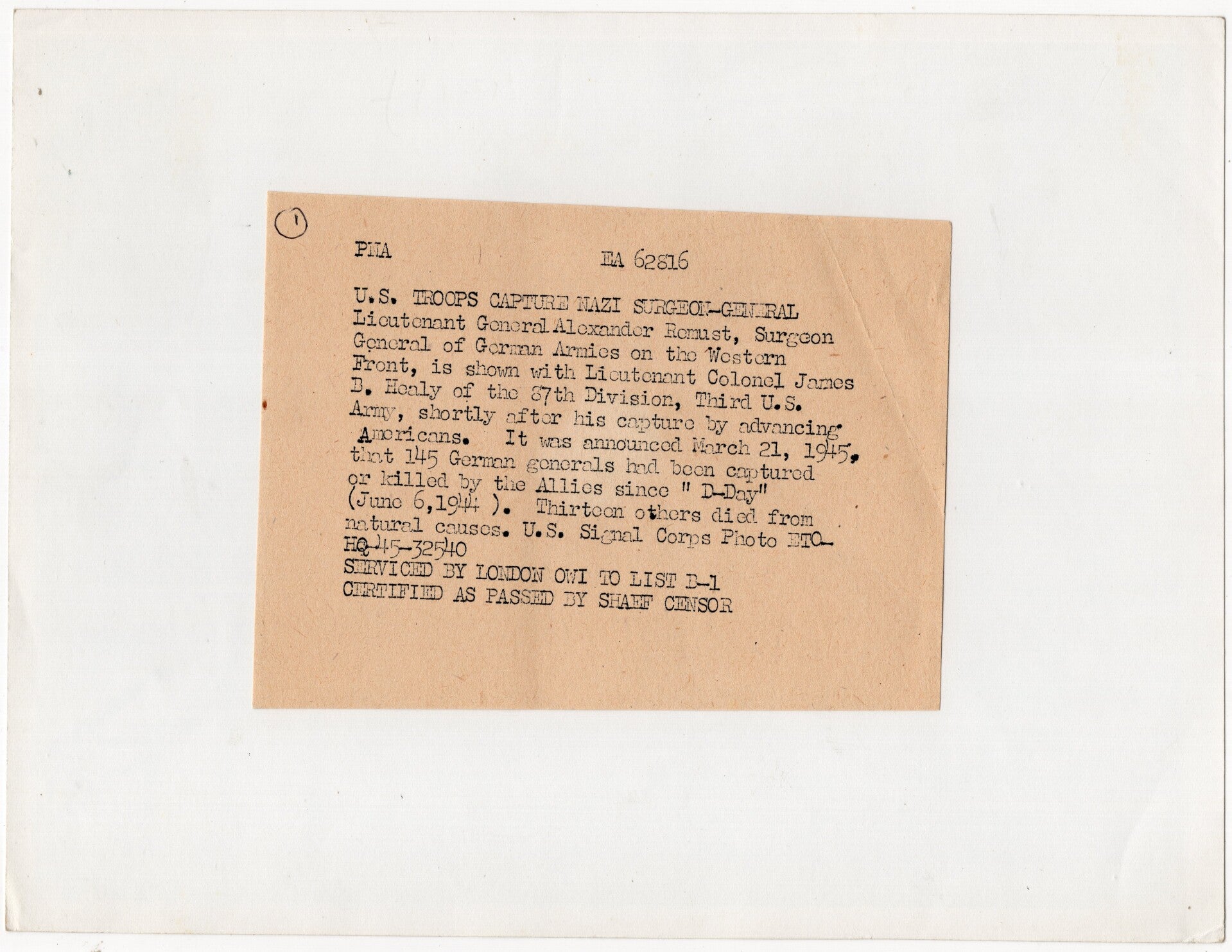 Originele Wo2 Duitse Persfoto - Luitenant-generaal Alexander Remust geeft zich over aan de Amerikaanse 87e Divisie (1945)