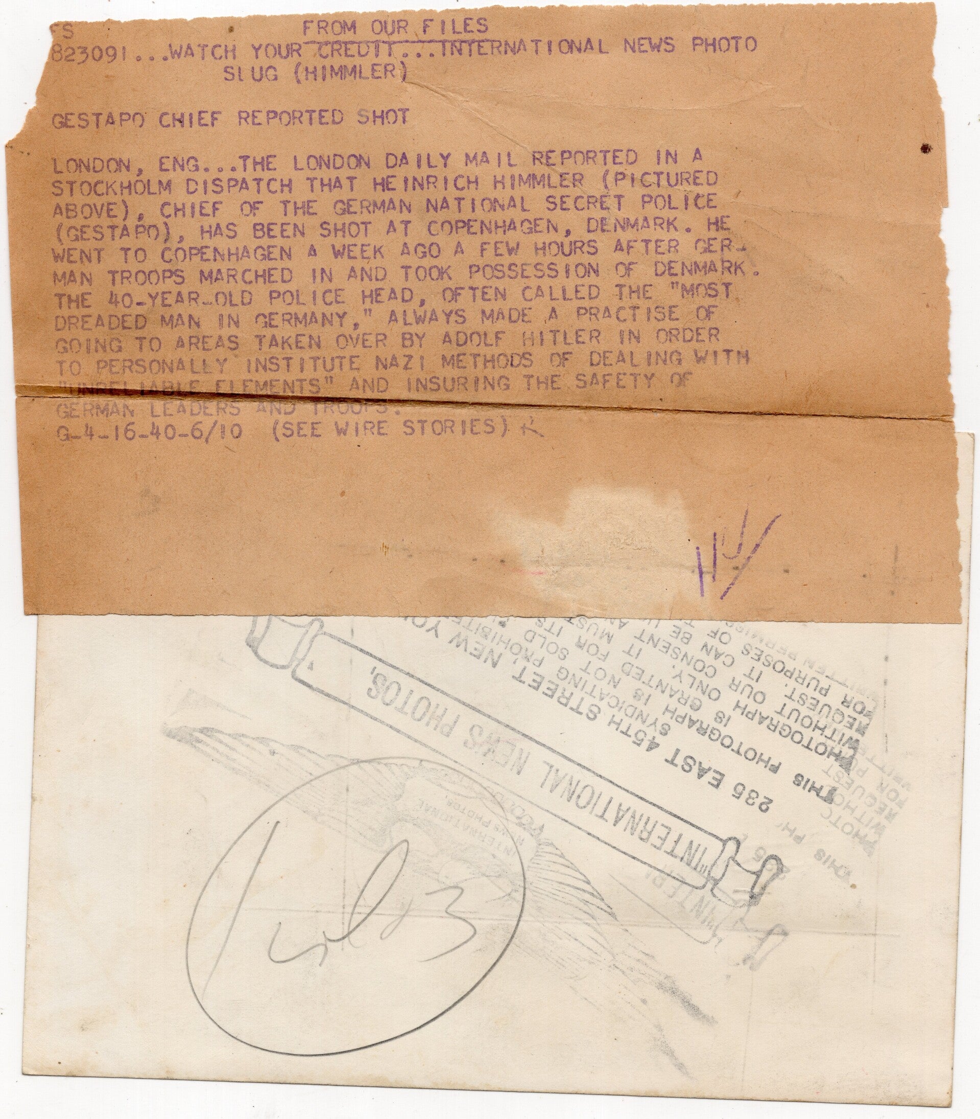 Press picture of Heinrich Himmler in a gala suit with medals and a sash. The text is about Himmler being shot in Copenhagen. As seen in the picture, the press agency has used his picture and marked a part of the photo.
