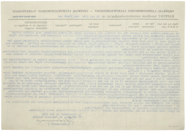 Origineel Wo2 Nederlands Document - Rapport van de Luchtwachtdienst van het Nederlandse Leger in Den Haag, 12 mei (1940)