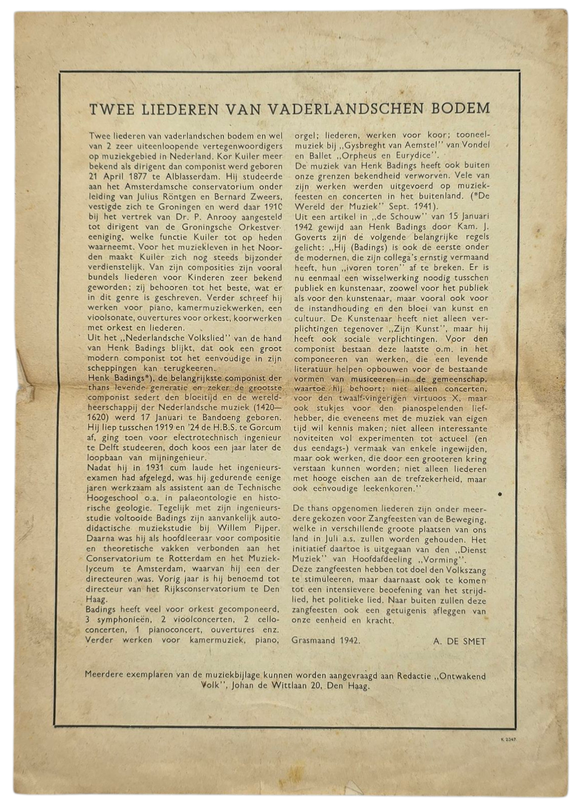Document with two songs, this was an add-on with Ontwakend Volk. By H. Badings, E. Breman and Kor Kuiler met H. W. vd. Mey.