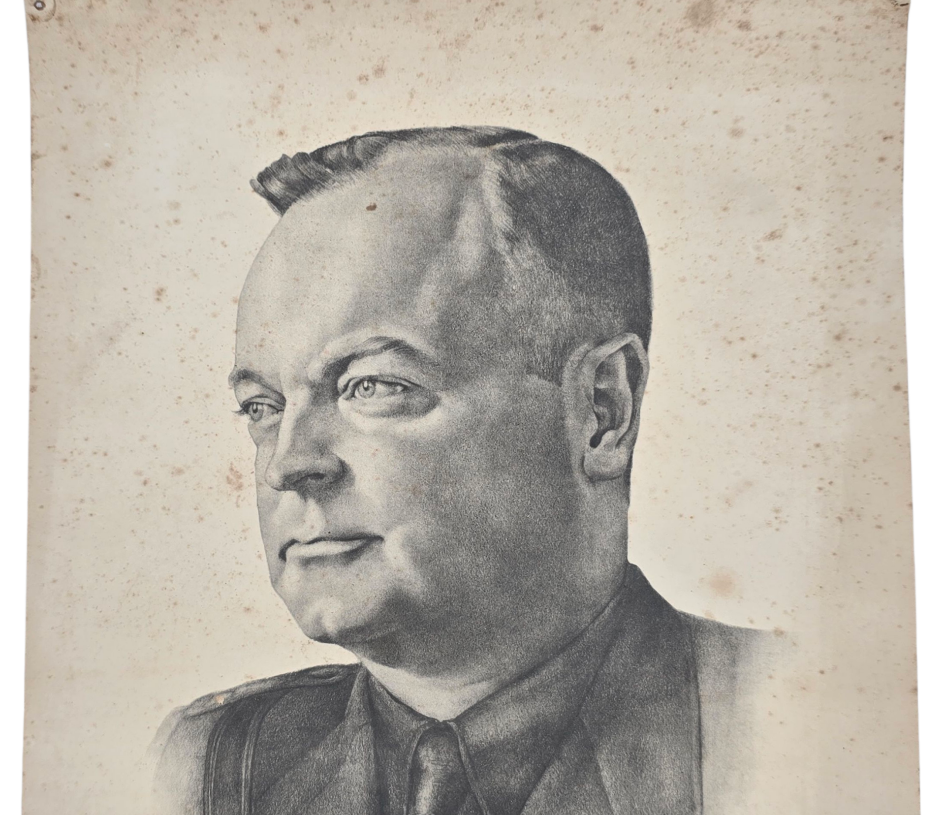Drawn (printed) portrait of Anton Mussert from 1940. It appears to be cropped on the sides to fit into a frame. It was put on somewhere with pins in the corner.