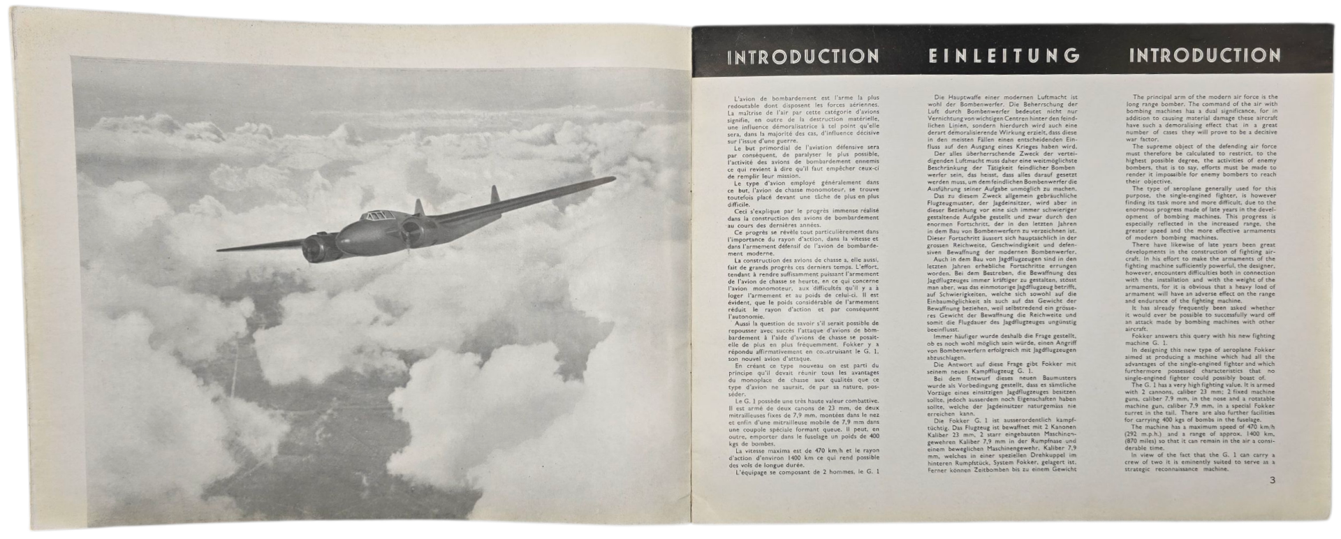 Prachtige en moeilijk te vinden brochure over het Fokker G1 gevechtsvliegtuig van de Fokkerfabriek in Amsterdam. Deze brochure is geschreven in het Frans, Duits en Engels om de internationale markt te bereiken. De G1 werd gepresenteerd op de Franse vliegtuigtentoonstelling. In deze periode waren vliegtuigen voor oorlogsdoeleinden interessant; ook andere landen dan Nederland vlogen met de Fokker G-1.