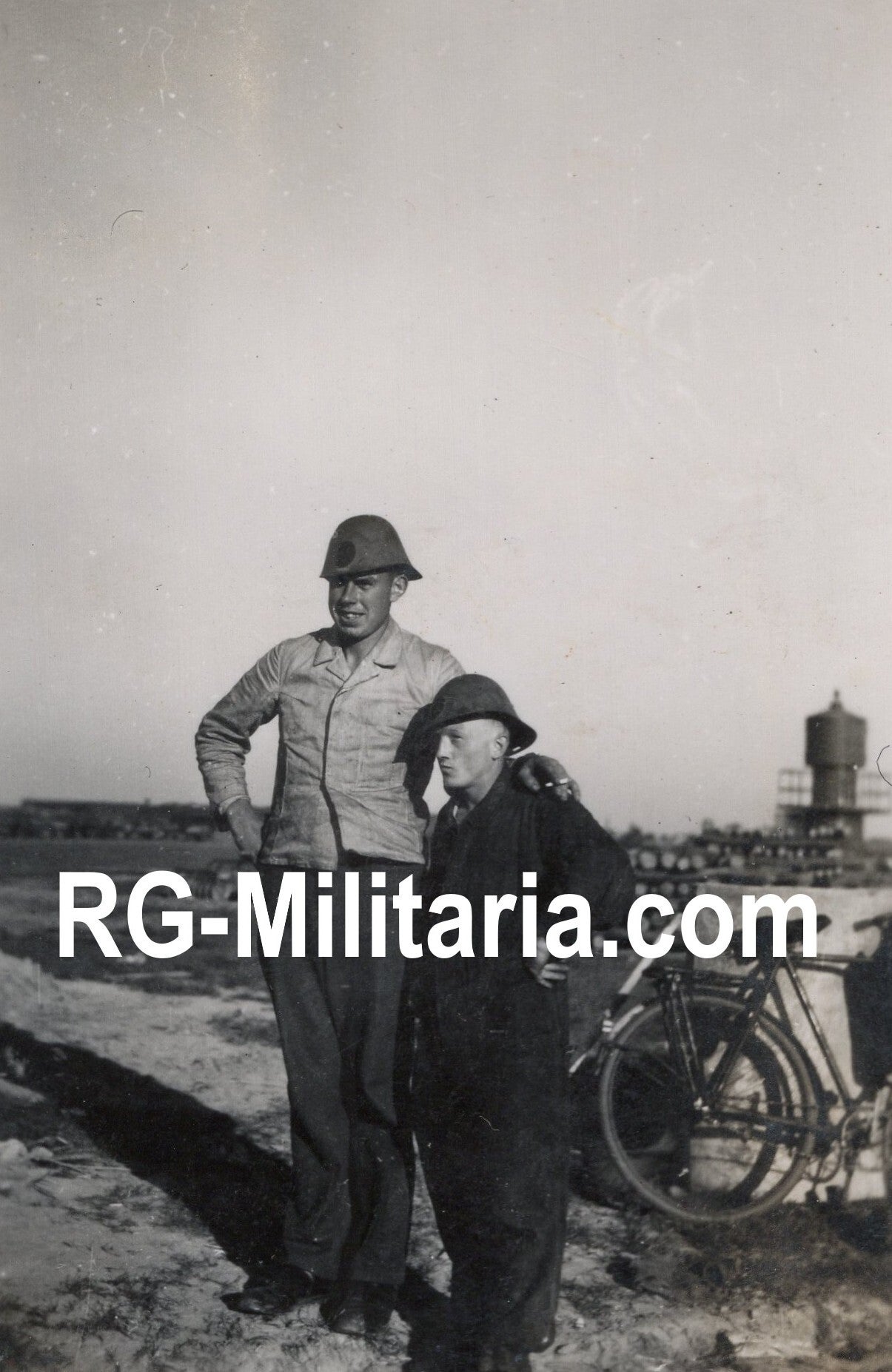 Original WW2 German Photo - Luftwaffe mechanics with Dutch helmets at Schiphol, Amsterdam, Holland (1940)