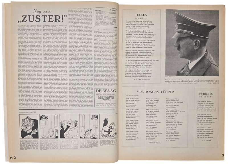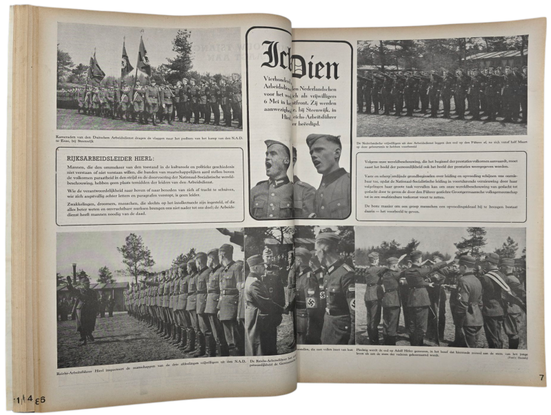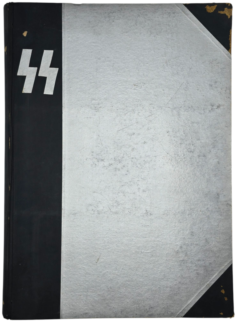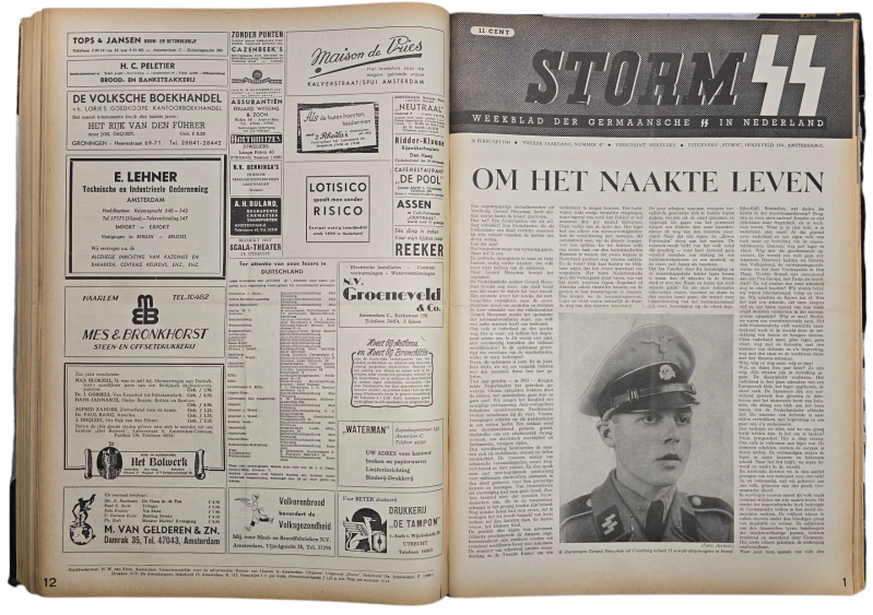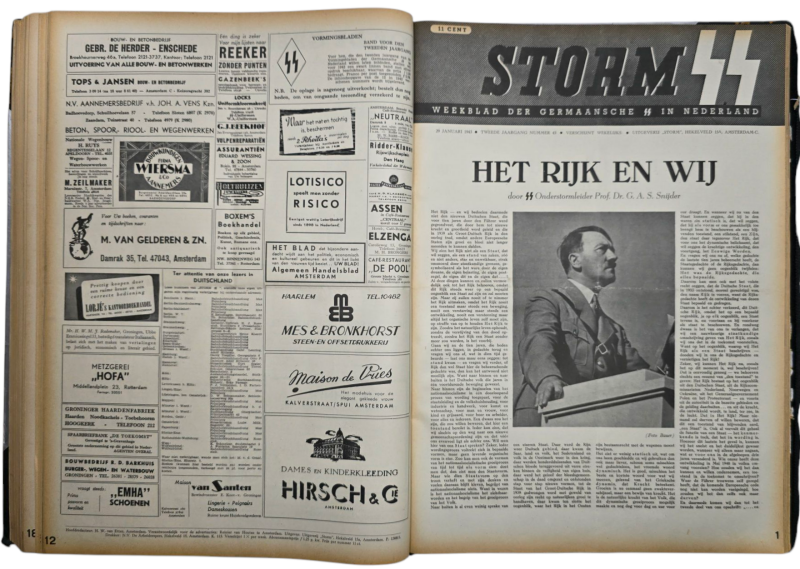 Interesting bound 2nd year of the Dutch Waffen SS newspaper ''Storm SS, Weekblad der Germaansche SS in Nederland''. This bound book consists of 52 newspaper editions, a full year. Includes a double number (38/39). Filled with many pictures, articles, and cartoons. With articles about Henk Feldmeijer, the Eastern Front, Gerardus Mooyman, the Dutch volunteer legion, and other front news. The book has been bound in linen and silver paper with SS runes on the cover. Some normal wear and tear that you see often with period-bound books.