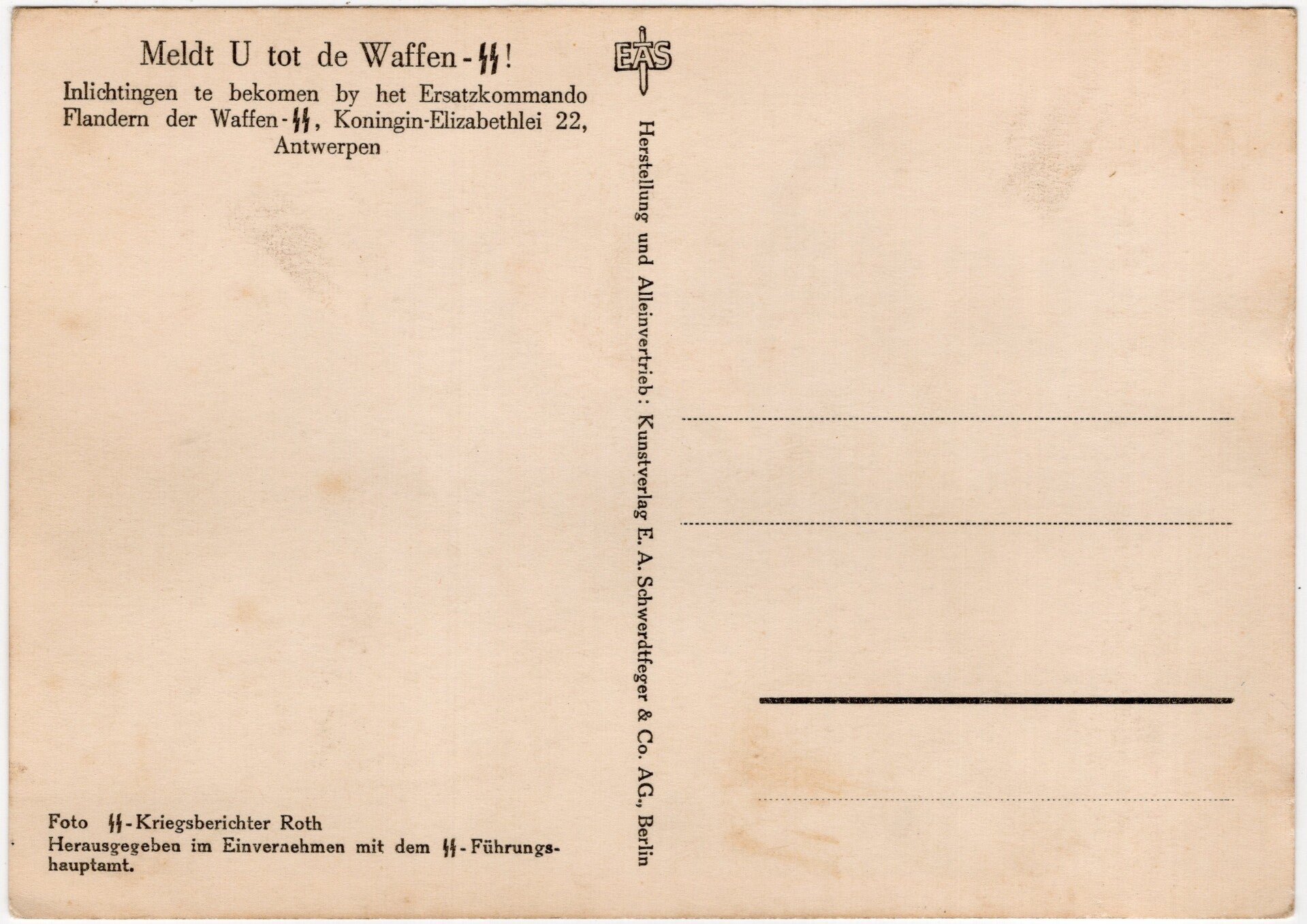 Hard to find Flemish postcard in the series ''Meldt U tot de Waffen-SS!''.