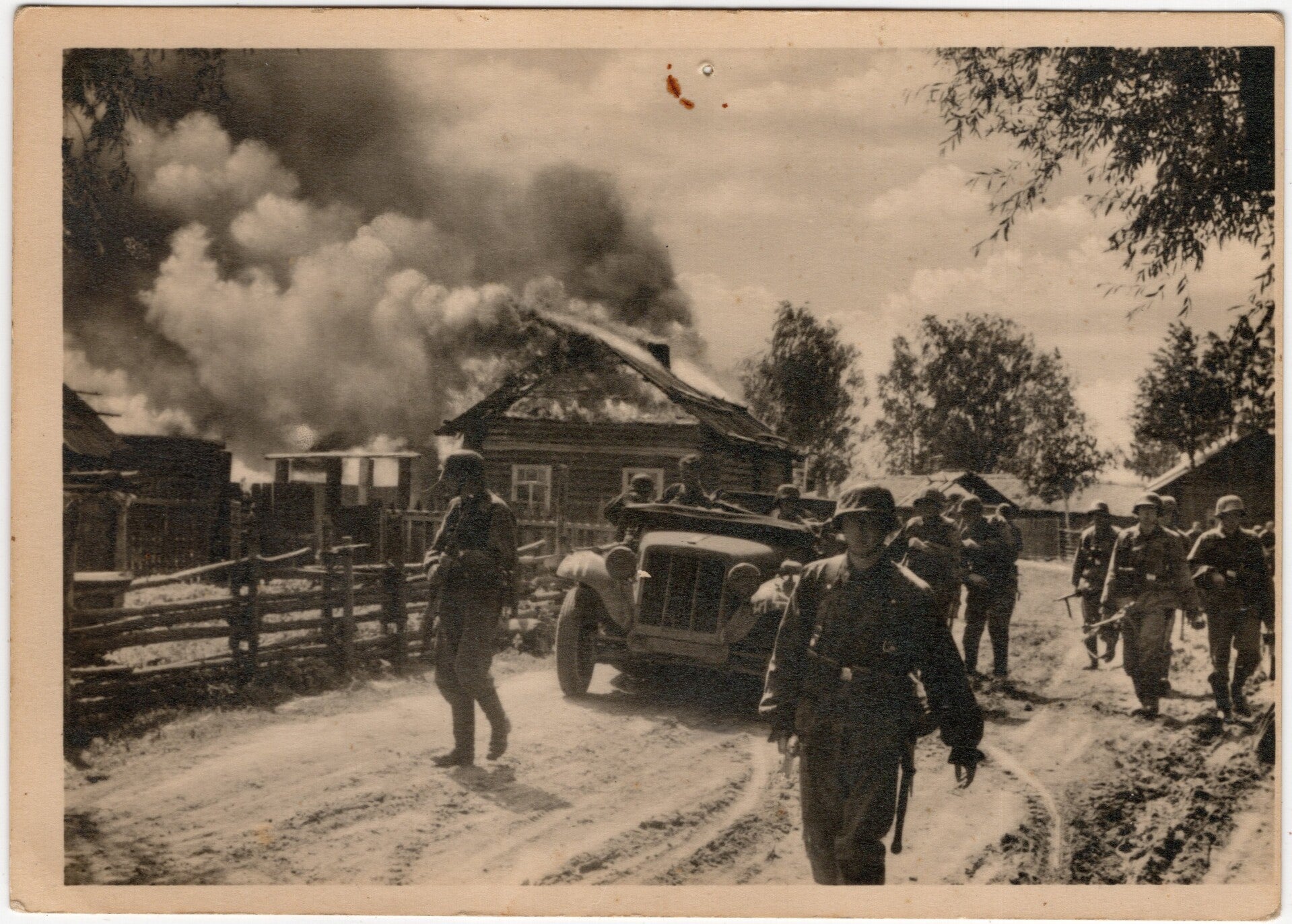 Original WW2 Flemish Waffen SS Postcard - ''Meldt U tot de Waffen-SS!'' Burning village