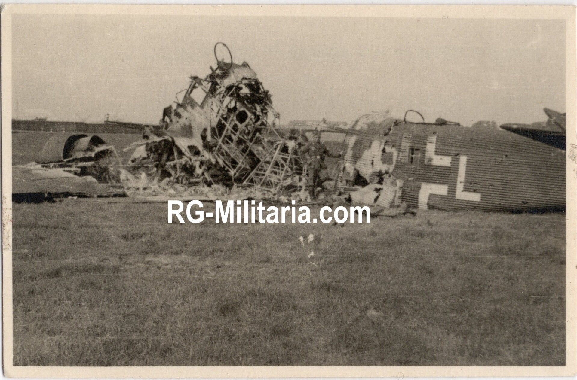 Original WW2 German Photo - German soldier on Rotterdam airfield Waalhaven with a destroyed Junkers JU 52 airplane, Holland (1940)