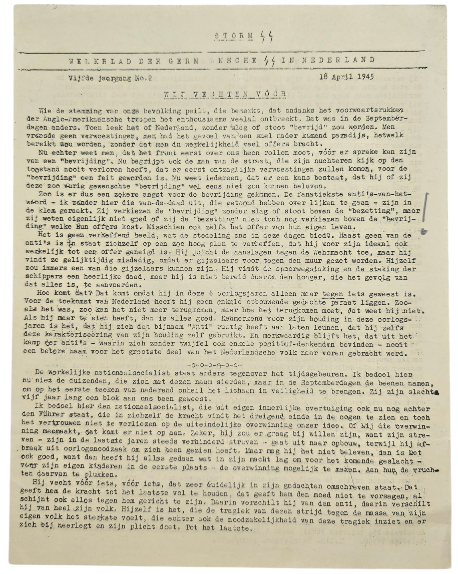 Storm SS was the newspaper for the Dutch Waffen SS sympathizers. The newspaper began in 1941 and ended in May 1945. The newspaper often shows (Dutch) Kriegsberichter photos, political articles, and caricatures.