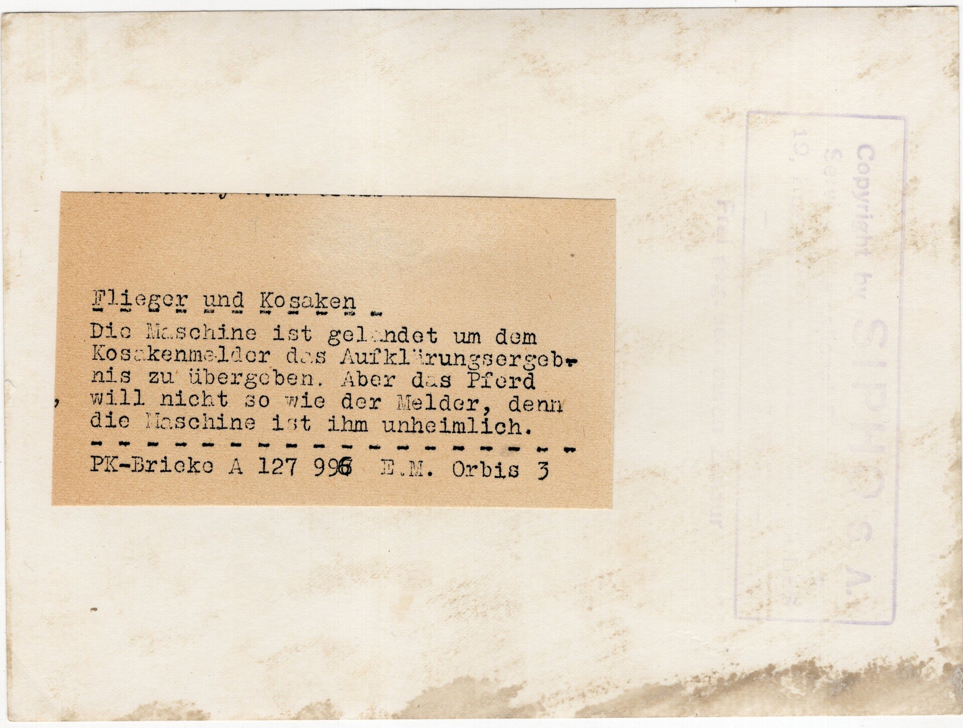 Original WW2 German Waffen SS Press Photo - Ostlegionen Eastern European SS Cavalry Kosaken Corps with horse taking a message from a Luftwaffe pilot (1944)