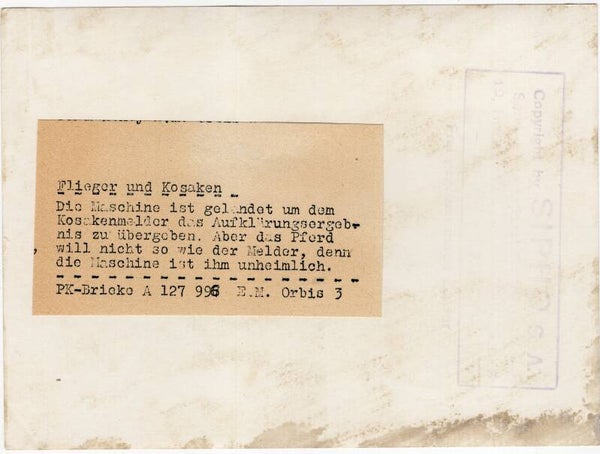 Originele Wo2 Duitse Persfoto - Ostlegioen Oost Europeaanse Waffen SS Kozakken Cavaleriekorps met paarden krijgt een bericht van een piloot (1944)