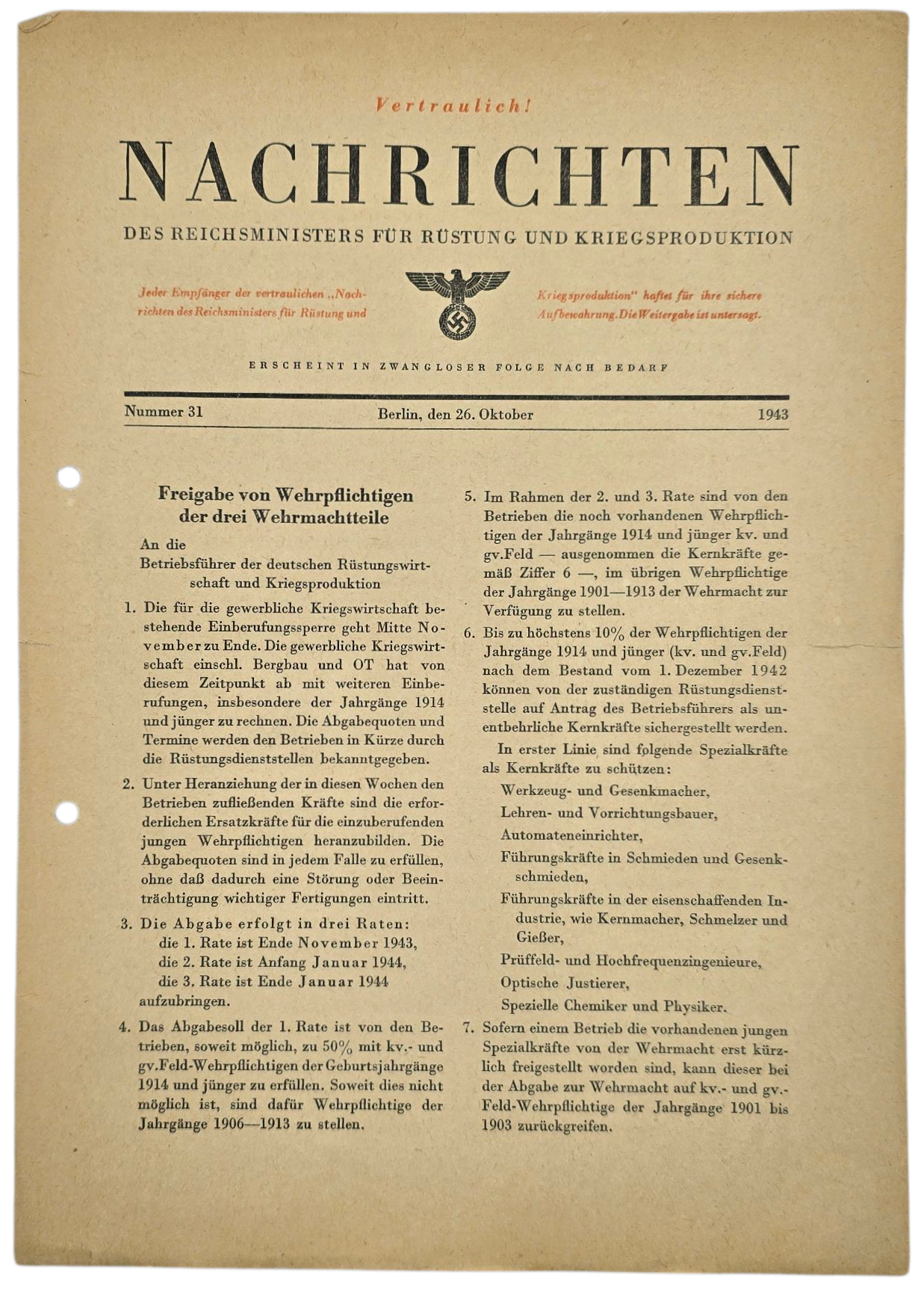 Origineel Wo2 Duits Document - Nachrichten des Reichsministers Für Rüstungs und Kriegsproduktion, Nummer 31 (1943)