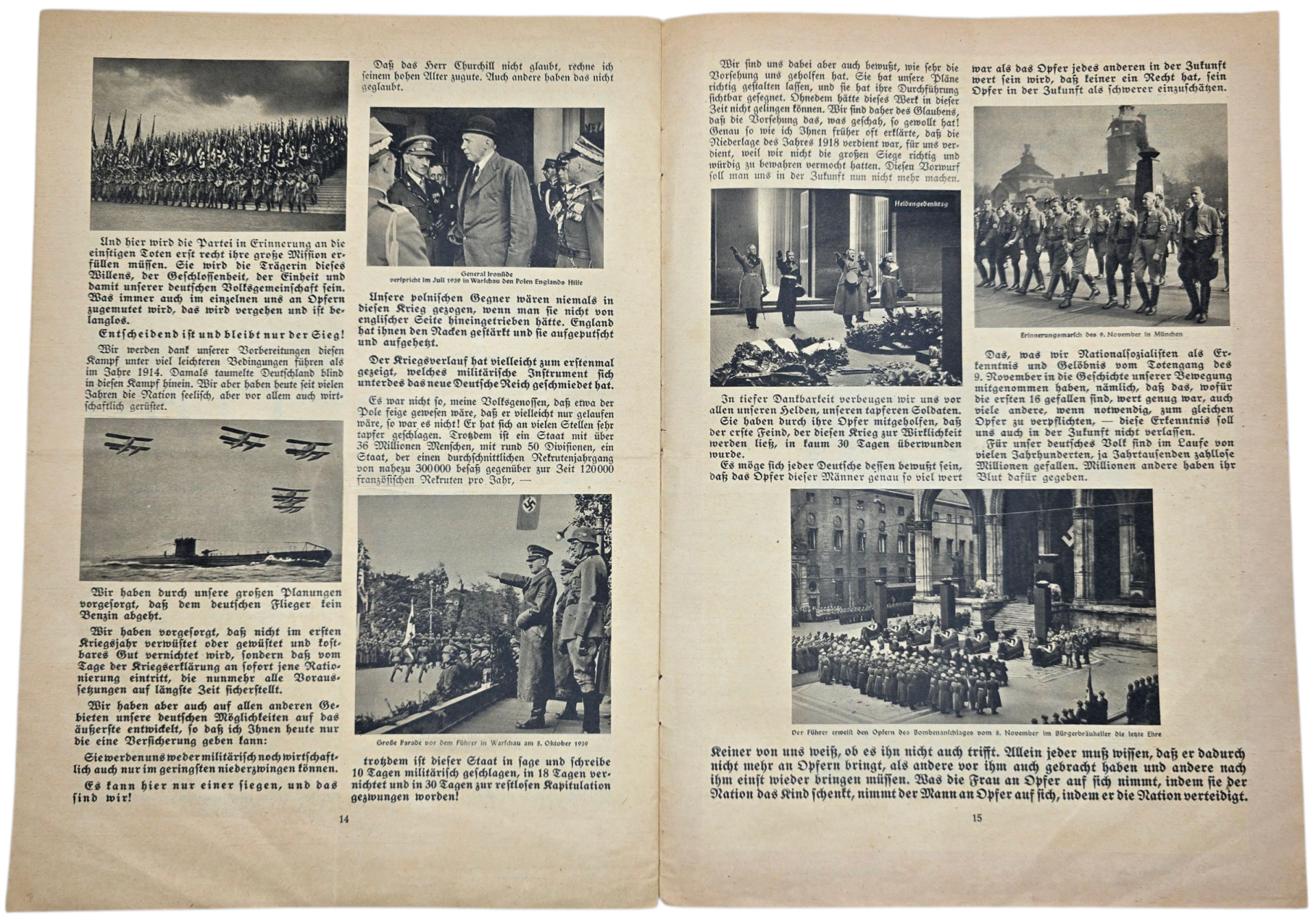Rare illustrated NSDAP brochure from Hitler's speech in the Burgerbraukeller on the 8th of November 1939. Just after this speech, a bomb exploded that should have assassinated Hitler on the spot. Unfortunately, he left in time, so the bomb did not kill him. Georg Elser, the attacker, was captured and sent to Dachau. He died in 1945. No mention of the attack inside of the brochure.
